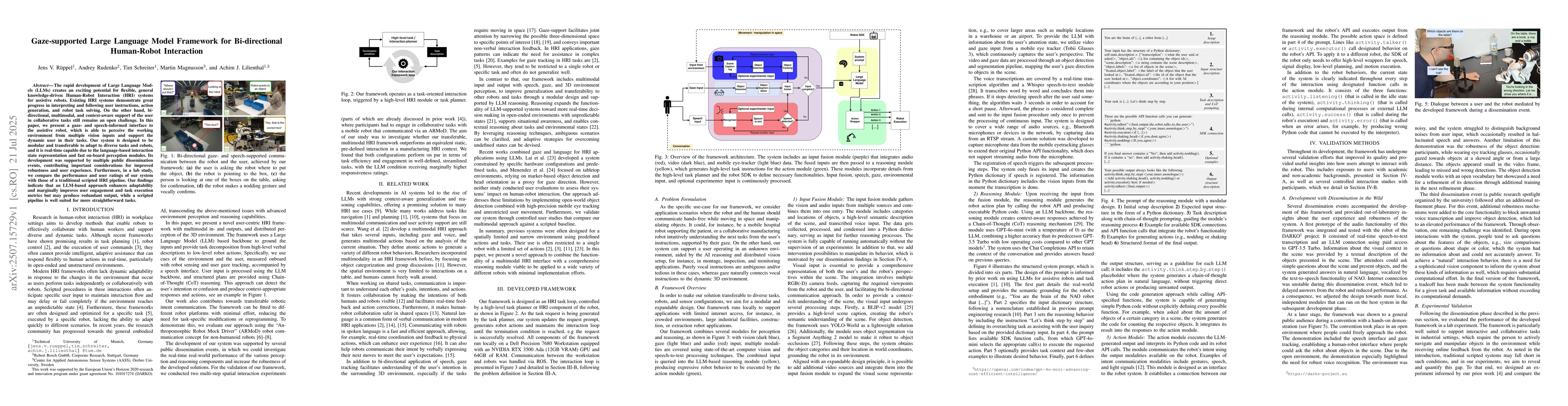 The rapid development of Large Language Models (LLMs) creates an exciting potential for flexible, general knowledge-driven Human-Robot Interaction (HRI) systems for assistive robots. Existing HRI systems demonstrate great progress in interpreting and following user instructions, action generation, and robot task solving. On the other hand, bi-directional, multi-modal, and context-aware support of the user in collaborative tasks still remains an open challenge. In this paper, we present a gaze- and speech-informed interface to the assistive robot, which is able to perceive the working environment from multiple vision inputs and support the dynamic user in their tasks. Our system is designed to be modular and transferable to adapt to diverse tasks and robots, and it is capable of real-time use of language-based interaction state representation and fast on board perception modules. Its development was supported by multiple public dissemination events, contributing important considerations for improved robustness and user experience. Furthermore, in two lab studies, we compare the performance and user ratings of our system with those of a traditional scripted HRI pipeline. Our findings indicate that an LLM-based approach enhances adaptability and marginally improves user engagement and task execution metrics but may produce redundant output, while a scripted pipeline is well suited for more straightforward tasks.