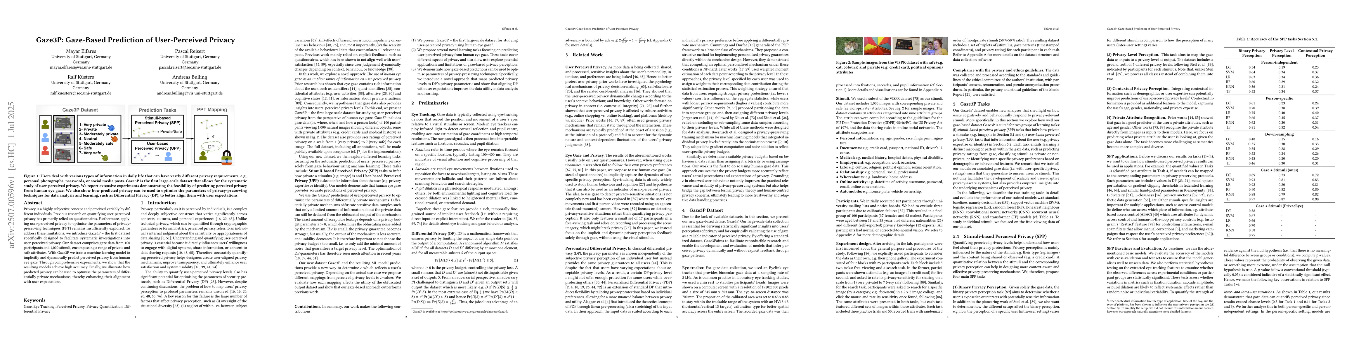 Privacy is a highly subjective concept and perceived variably by different individuals. Previous research on quantifying user-perceived privacy has primarily relied on questionnaires. Furthermore, applying user-perceived privacy to optimise the parameters of privacy-preserving techniques (PPT) remains insufficiently explored. To address these limitations, we introduce Gaze3P -- the first dataset specifically designed to facilitate systematic investigations into user-perceived privacy. Our dataset comprises gaze data from 100 participants and 1,000 stimuli, encompassing a range of private and safe attributes. With Gaze3P, we train a machine learning model to implicitly and dynamically predict perceived privacy from human eye gaze. Through comprehensive experiments, we show that the resulting models achieve high accuracy. Finally, we illustrate how predicted privacy can be used to optimise the parameters of differentially private mechanisms, thereby enhancing their alignment with user expectations.