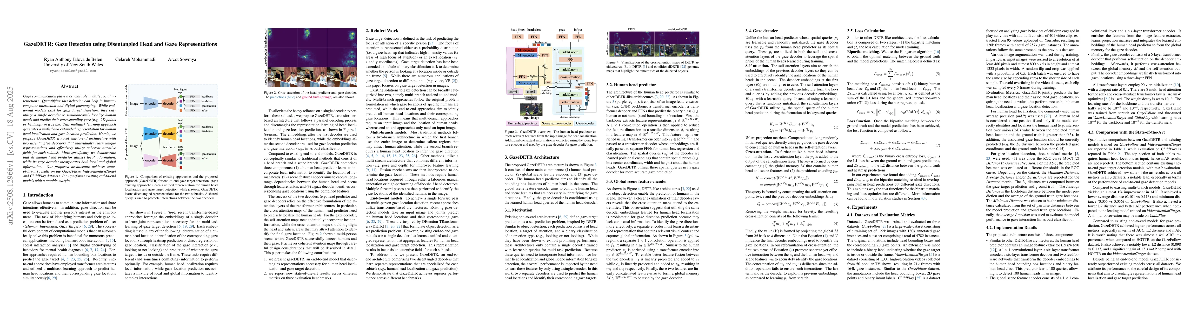 Gaze communication plays a crucial role in daily social interactions. Quantifying this behavior can help in human-computer interaction and digital phenotyping. While end-to-end models exist for gaze target detection, they only utilize a single decoder to simultaneously localize human heads and predict their corresponding gaze (e.g., 2D points or heatmap) in a scene. This multitask learning approach generates a unified and entangled representation for human head localization and gaze location prediction. Herein, we propose GazeDETR, a novel end-to-end architecture with two disentangled decoders that individually learn unique representations and effectively utilize coherent attentive fields for each subtask. More specifically, we demonstrate that its human head predictor utilizes local information, while its gaze decoder incorporates both local and global information. Our proposed architecture achieves state-of-the-art results on the GazeFollow, VideoAttentionTarget and ChildPlay datasets. It outperforms existing end-to-end models with a notable margin.