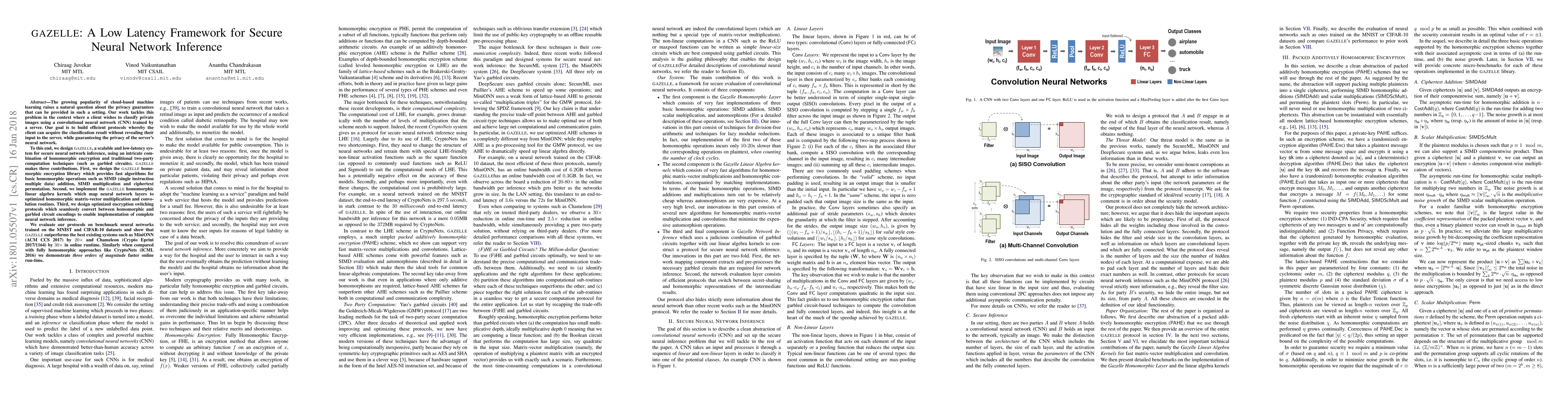 Gazelle is a low-latency framework for secure neural network inference that combines homomorphic encryption and garbled circuits to protect both client inputs and server models. It outperforms existing systems by significantly reducing online runtime while maintaining privacy guarantees.