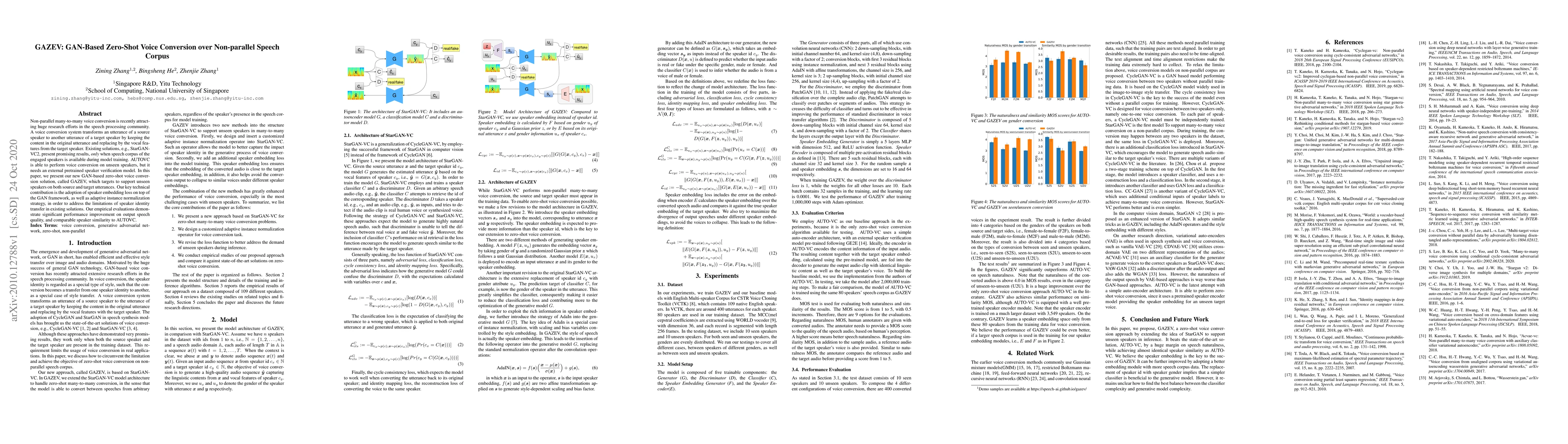 GAZEV presents a GAN-based zero-shot voice conversion method for non-parallel speech, enhancing unseen speaker support with speaker embedding loss and adaptive instance normalization, achieving better speech quality and speaker similarity compared to existing models.