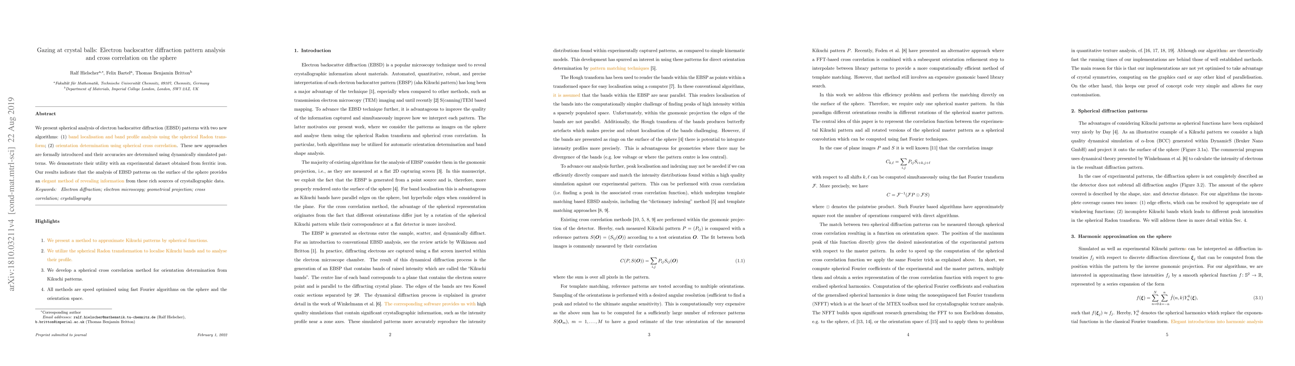 This paper introduces two new algorithms for spherical analysis of electron backscatter diffraction (EBSD) patterns: one for band localization and profile analysis using the spherical Radon transform, and another for orientation determination via spherical cross correlation. The effectiveness of these methods is demonstrated on both simulated and experimental ferritic iron datasets.