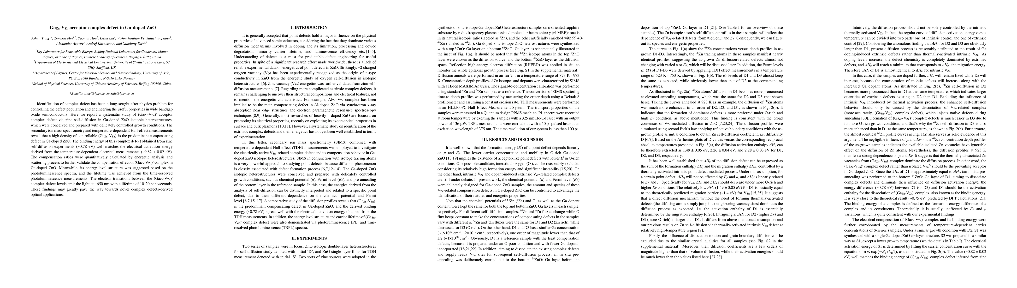 This study identifies the (GaZn-VZn)- acceptor complex defect in Ga-doped ZnO as the predominant compensating defect, determined through zinc self-diffusion and electrical measurements. The complex defect's binding energy and energy level structure suggest potential for novel optical applications.