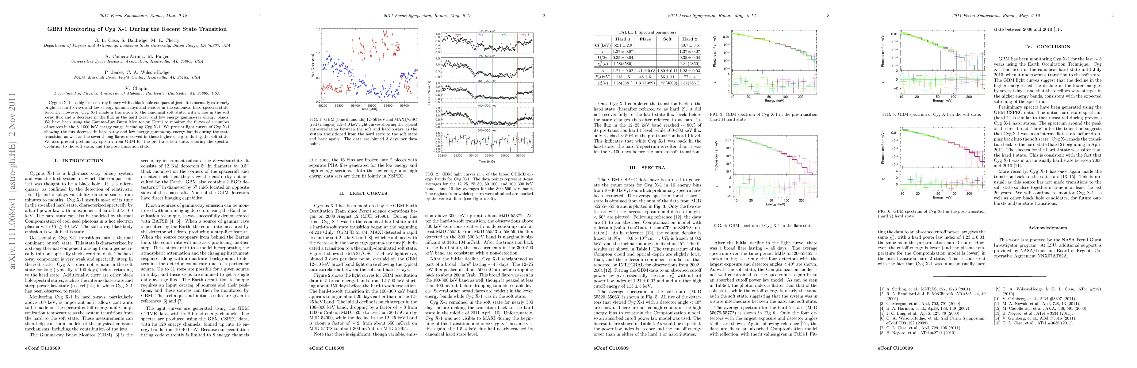 Cygnus X-1 is a high-mass x-ray binary with a black hole compact object. It is normally extremely bright in hard x-rays and low energy gamma rays and resides in the canonical hard spectral state. Recently, however, Cyg X-1 made a transition to the canonical soft state, with a rise in the soft x-ray flux and a decrease in the flux in the hard x-ray and low energy gamma-ray energy bands. We have been using the Gamma-Ray Burst Monitor on Fermi to monitor the fluxes of a number of sources in the 8--1000 keV energy range, including Cyg X-1. We present light curves of Cyg X-1 showing the flux decrease in hard x-ray and low energy gamma-ray energy bands during the state transition as well as the several long flares observed in these higher energies during the soft state. We also present preliminary spectra from GBM for the pre-transition state, showing the spectral evolution to the soft state, and the post-transition state.