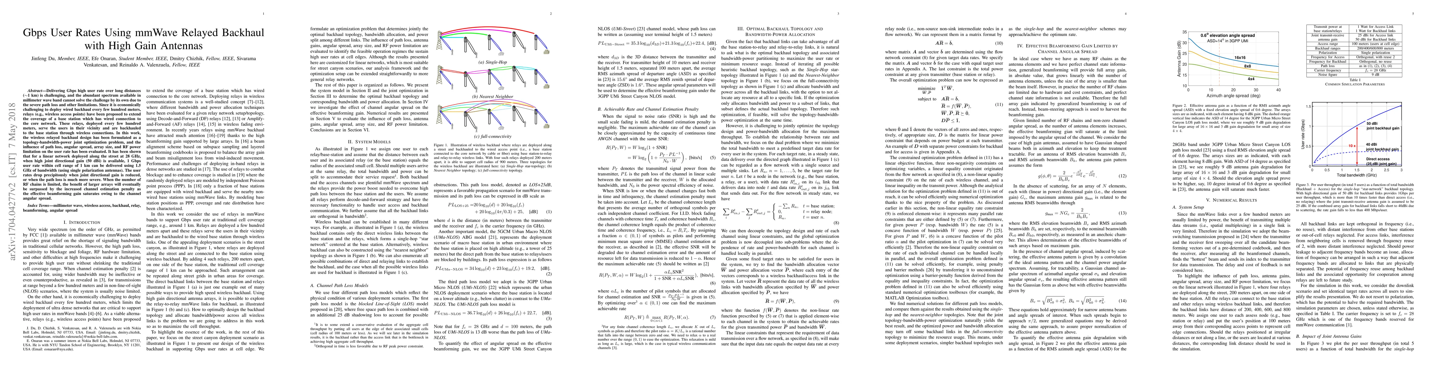 Delivering Gbps high user rate over long distances (around 1 km) is challenging, and the abundant spectrum available in millimeter wave band cannot solve the challenge by its own due to the severe path loss and other limitations. Since it is economically challenging to deploy wired backhaul every few hundred meters, relays (e.g., wireless access points) have been proposed to extend the coverage of a base station which has wired connection to the core network. These relays, deployed every few hundred meters, serve the users in their vicinity and are backhauled to the base station through wireless connections. In this work, the wireless relayed backhaul design has been formulated as a topology-bandwidth-power joint optimization problem, and the influence of path loss, angular spread, array size, and RF power limitation on the user rate has been evaluated. It has been shown that for a linear network deployed along the street at 28 GHz, when high joint directional gain (50 dBi) is available, 1 Gbps user rate within cell range of 1 km can be delivered using 1.5 GHz of bandwidth (using single polarization antennas). The user rates drop precipitously when joint directional gain is reduced, or when the path loss is much more severe. When the number of RF chains is limited, the benefit of larger arrays will eventually be surpassed by the increased channel estimation penalty as the effective beamforming gain saturates owing to the channel angular spread.