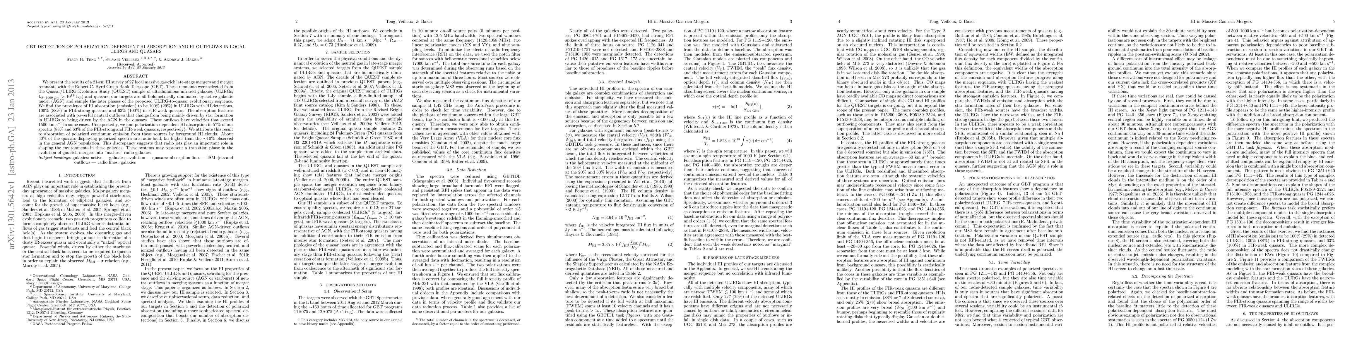 This study uses the GBT to survey HI absorption and outflows in 27 local massive gas-rich merger remnants, finding 100% HI absorption in ULIRGs and quasars, with polarization-dependent absorption in 57% of the spectra. The outflows, driven by star formation and AGN, suggest a transition phase in the evolution of gas-rich mergers into radio galaxies.