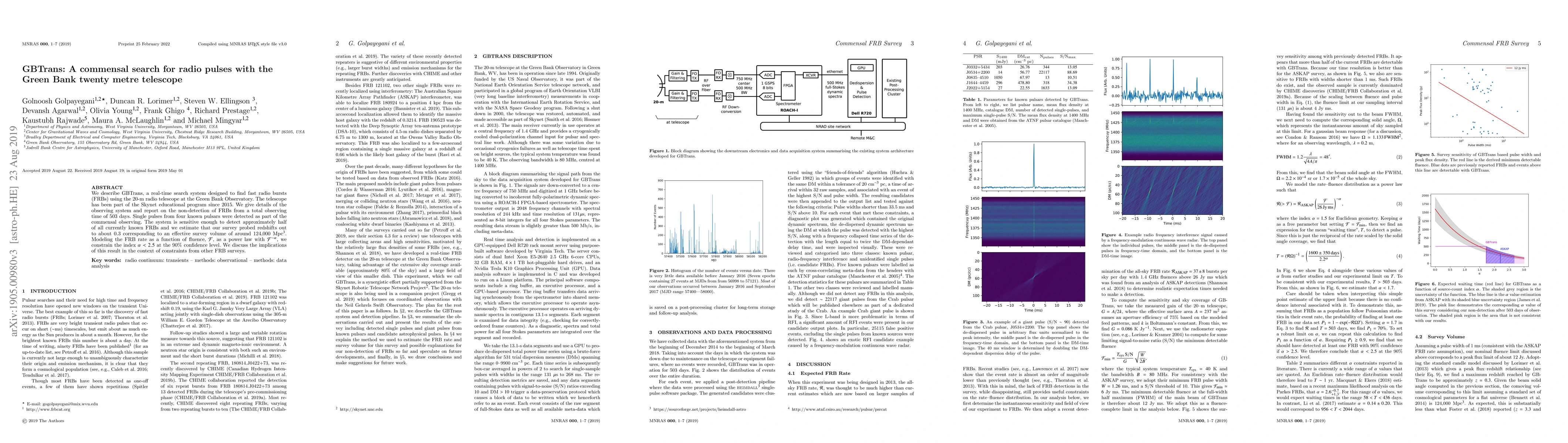 GBTrans is a real-time search system using the Green Bank Observatory's 20-m telescope to detect fast radio bursts (FRBs), with no FRBs detected over 503 days of observation. The system's sensitivity allows for probing redshifts up to 0.3, constraining the FRB rate index to $\alpha < 2.5$ at 90% confidence.