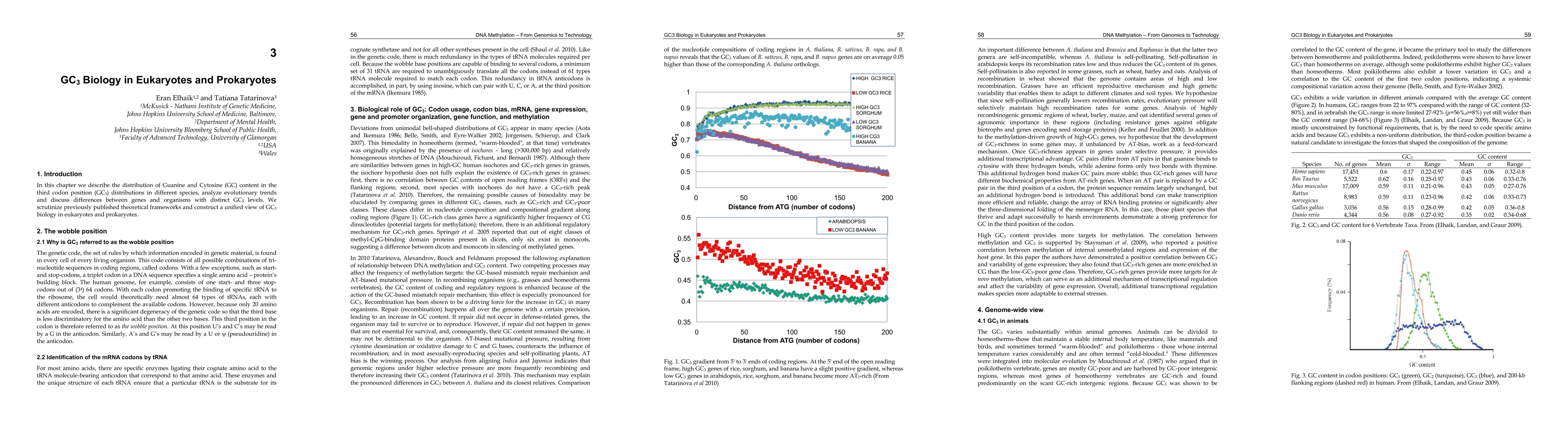 We describe the distribution of Guanine and Cytosine (GC) content in the third codon position (GC3) distributions in different species, analyze evolutionary trends and discuss differences between genes and organisms with distinct GC3 levels. We scrutinize previously published theoretical frameworks and construct a unified view of GC3 biology in eukaryotes and prokaryotes.