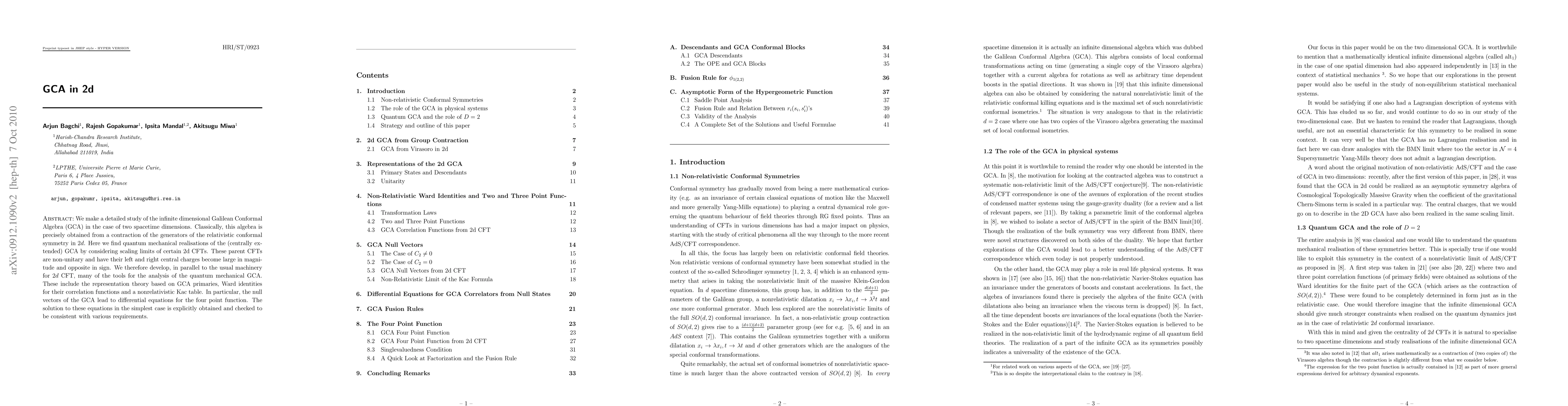 The paper studies the infinite-dimensional Galilean Conformal Algebra (GCA) in two spacetime dimensions, finding quantum mechanical realizations by considering scaling limits of non-unitary 2D CFTs with large central charges of opposite signs.