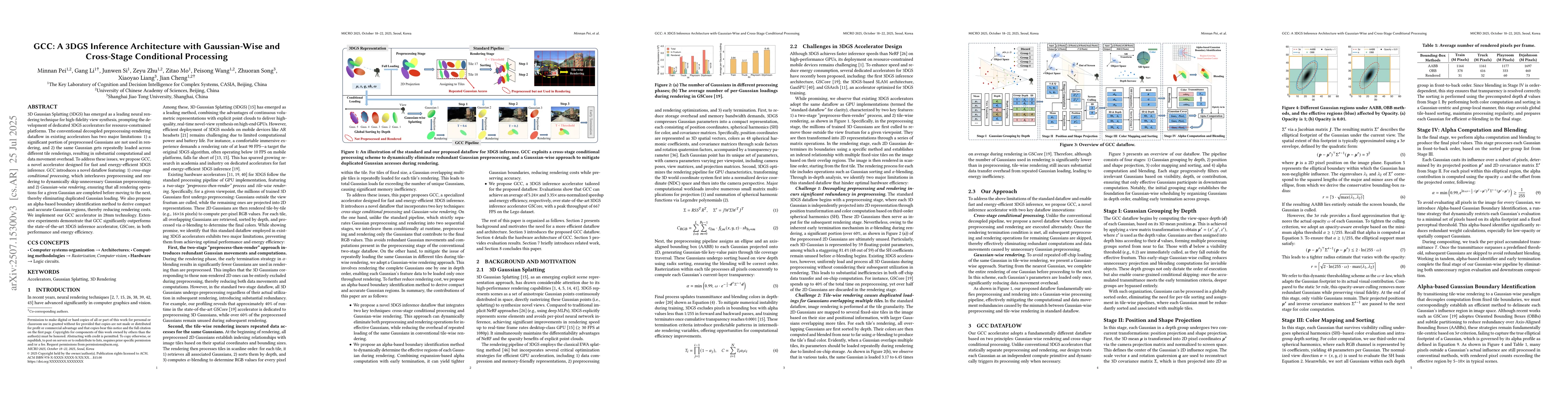 3D Gaussian Splatting (3DGS) has emerged as a leading neural rendering technique for high-fidelity view synthesis, prompting the development of dedicated 3DGS accelerators for mobile applications. Through in-depth analysis, we identify two major limitations in the conventional decoupled preprocessing-rendering dataflow adopted by existing accelerators: 1) a significant portion of preprocessed Gaussians are not used in rendering, and 2) the same Gaussian gets repeatedly loaded across different tile renderings, resulting in substantial computational and data movement overhead. To address these issues, we propose GCC, a novel accelerator designed for fast and energy-efficient 3DGS inference. At the dataflow level, GCC introduces: 1) cross-stage conditional processing, which interleaves preprocessing and rendering to dynamically skip unnecessary Gaussian preprocessing; and 2) Gaussian-wise rendering, ensuring that all rendering operations for a given Gaussian are completed before moving to the next, thereby eliminating duplicated Gaussian loading. We also propose an alpha-based boundary identification method to derive compact and accurate Gaussian regions, thereby reducing rendering costs. We implement our GCC accelerator in 28nm technology. Extensive experiments demonstrate that GCC significantly outperforms the state-of-the-art 3DGS inference accelerator, GSCore, in both performance and energy efficiency.