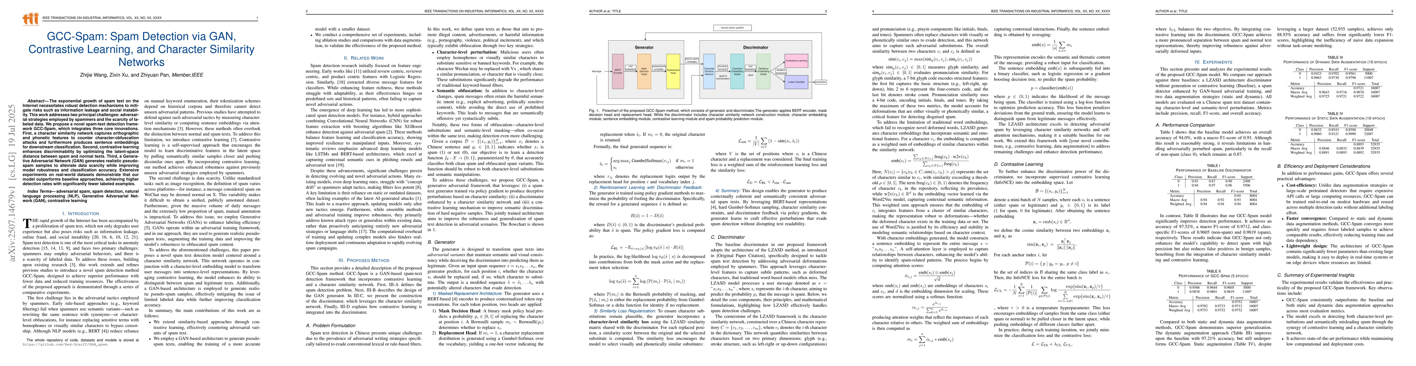 The exponential growth of spam text on the Internet necessitates robust detection mechanisms to mitigate risks such as information leakage and social instability. This work addresses two principal challenges: adversarial strategies employed by spammers and the scarcity of labeled data. We propose a novel spam-text detection framework GCC-Spam, which integrates three core innovations. First, a character similarity network captures orthographic and phonetic features to counter character-obfuscation attacks and furthermore produces sentence embeddings for downstream classification. Second, contrastive learning enhances discriminability by optimizing the latent-space distance between spam and normal texts. Third, a Generative Adversarial Network (GAN) generates realistic pseudo-spam samples to alleviate data scarcity while improving model robustness and classification accuracy. Extensive experiments on real-world datasets demonstrate that our model outperforms baseline approaches, achieving higher detection rates with significantly fewer labeled examples.