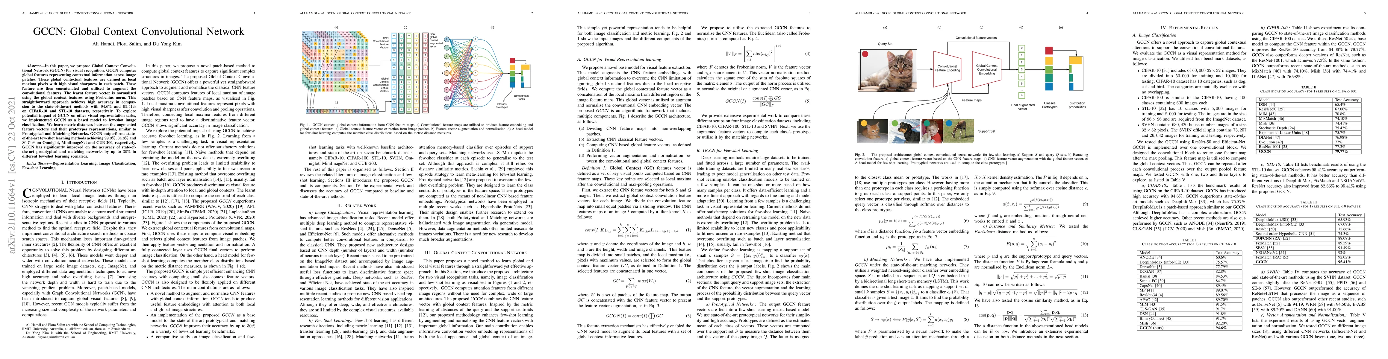 In this paper, we propose Global Context Convolutional Network (GCCN) for visual recognition. GCCN computes global features representing contextual information across image patches. These global contextual features are defined as local maxima pixels with high visual sharpness in each patch. These features are then concatenated and utilised to augment the convolutional features. The learnt feature vector is normalised using the global context features using Frobenius norm. This straightforward approach achieves high accuracy in compassion to the state-of-the-art methods with 94.6% and 95.41% on CIFAR-10 and STL-10 datasets, respectively. To explore potential impact of GCCN on other visual representation tasks, we implemented GCCN as a based model to few-shot image classification. We learn metric distances between the augmented feature vectors and their prototypes representations, similar to Prototypical and Matching Networks. GCCN outperforms state-of-the-art few-shot learning methods achieving 99.9%, 84.8% and 80.74% on Omniglot, MiniImageNet and CUB-200, respectively. GCCN has significantly improved on the accuracy of state-of-the-art prototypical and matching networks by up to 30% in different few-shot learning scenarios.