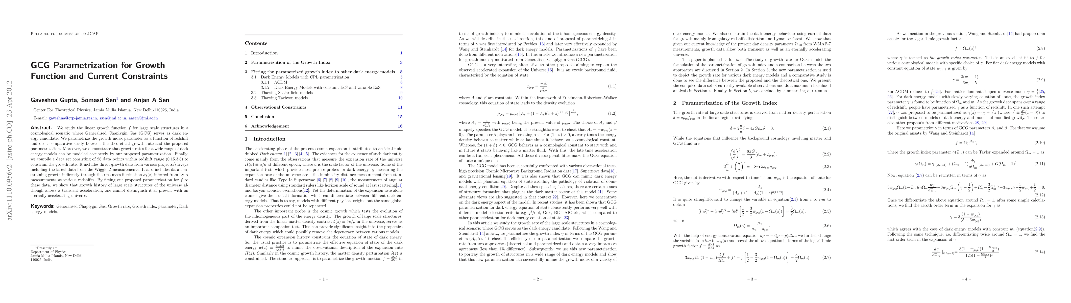We study the linear growth function $f$ for large scale structures in a cosmological scenario where Generalised Chaplygin Gas (GCG) serves as dark energy candidate. We parametrize the growth index parameter as a function of redshift and do a comparative study between the theoretical growth rate and the proposed parametrization. Moreover, we demonstrate that growth rates for a wide range of dark energy models can be modeled accurately by our proposed parametrization. Finally, we compile a data set consisting of 28 data points within redshift range (0.15,3.8) to constrain the growth rate. It includes direct growth data from various projects/surveys including the latest data from the Wiggle-Z measurements. It also includes data constraining growth indirectly through the rms mass fluctuation $\sigma_8(z)$ inferred from Ly-$\alpha$ measurements at various redshifts. By fitting our proposed parametrization for $f$ to these data, we show that growth history of large scale structures of the universe although allows a transient acceleration, one cannot distinguish it at present with an eternally accelerating universe.