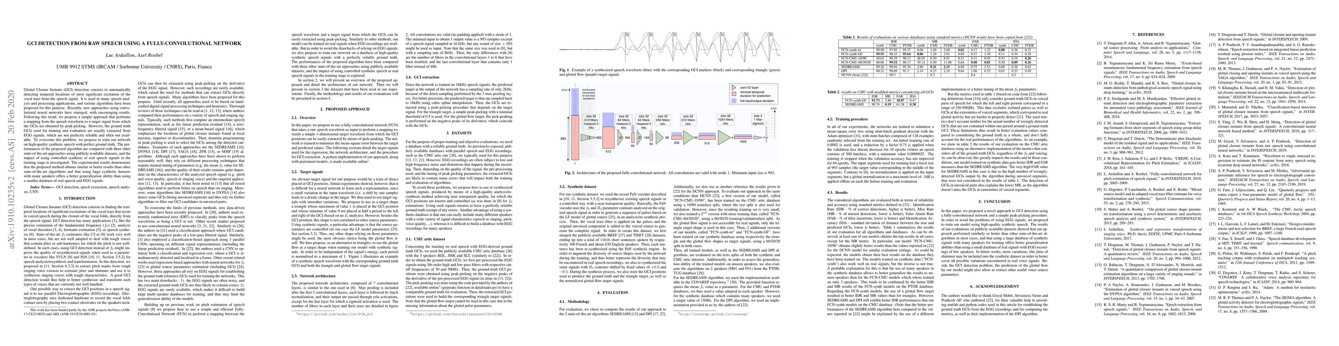 This paper proposes a fully-convolutional network for detecting Glottal Closure Instants (GCI) from raw speech, trained on synthetic speech with perfect ground truth. Experimental results show the method performs comparably or better than state-of-the-art approaches, especially when trained on large synthetic datasets.