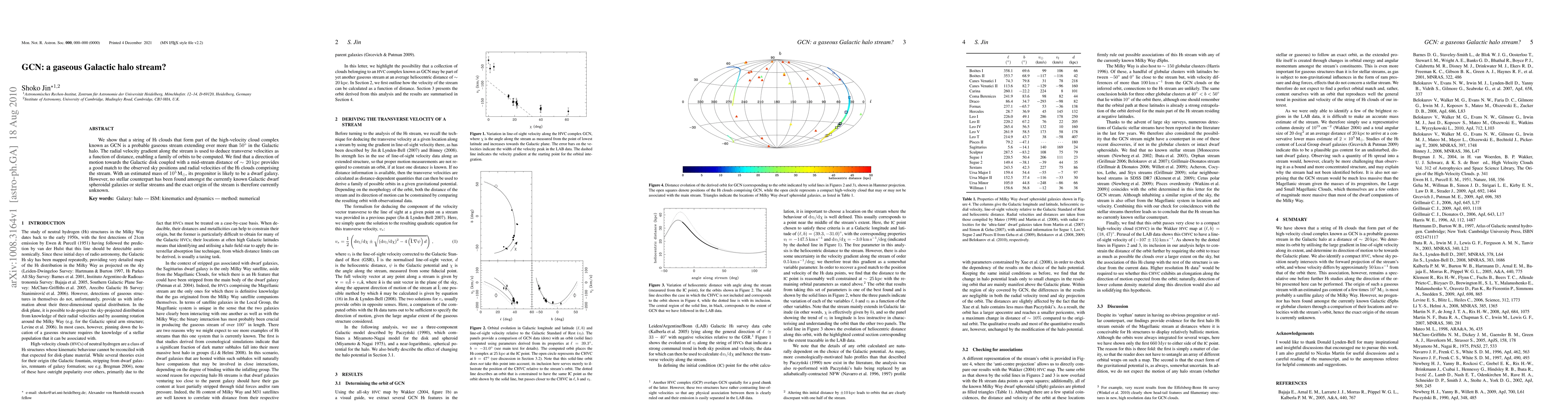 This paper identifies a gaseous stream in the Galactic halo, known as GCN, composed of a series of HI clouds, likely originating from a dwarf galaxy progenitor. The stream's radial velocity gradient and transverse velocities suggest it is moving towards the Galactic disk at a distance of ~20 kpc, though its exact origin remains undetermined.