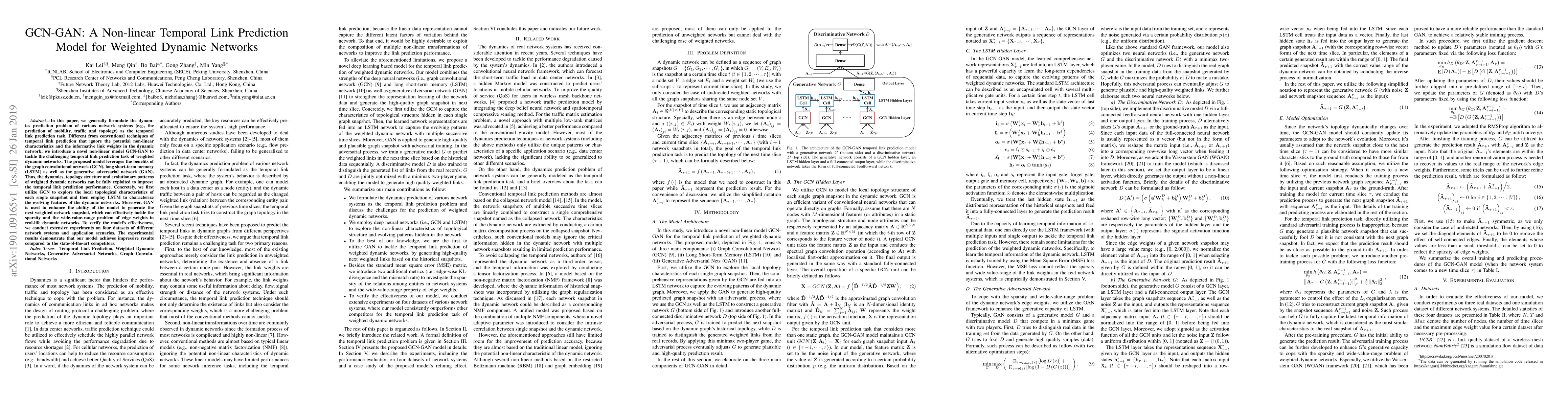 This paper introduces GCN-GAN, a novel non-linear model for temporal link prediction in weighted dynamic networks, leveraging GCN, LSTM, and GAN to capture network dynamics and improve prediction performance. Experimental results on various datasets show significant improvements over existing methods.