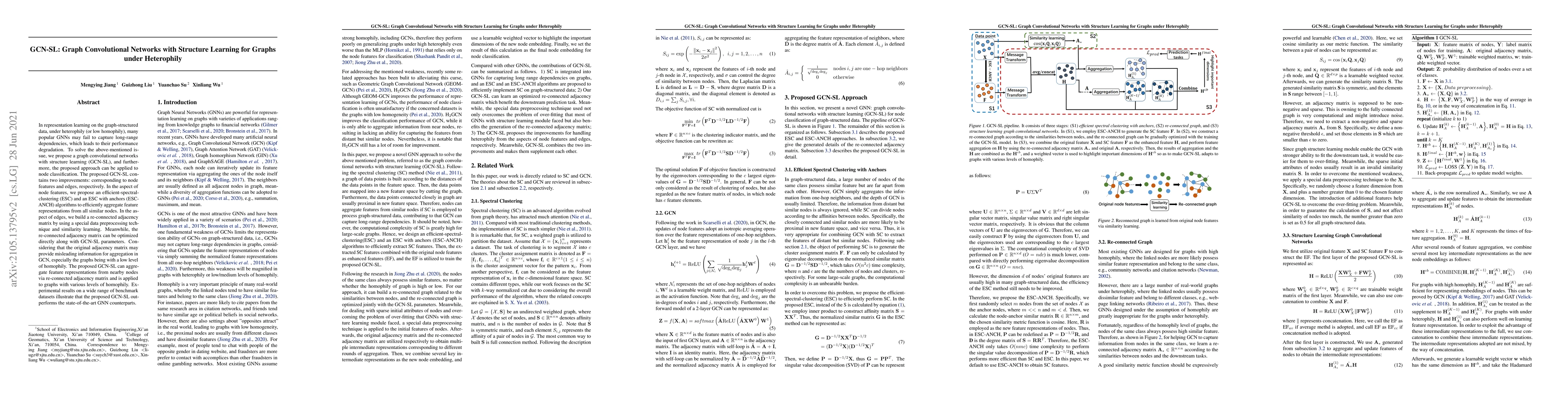 The paper proposes GCN-SL, a graph convolutional network with structure learning to address performance degradation in heterophilic graphs. It introduces efficient spectral clustering algorithms and a re-connected adjacency matrix to better capture long-range dependencies, outperforming state-of-the-art GNNs in node classification tasks.