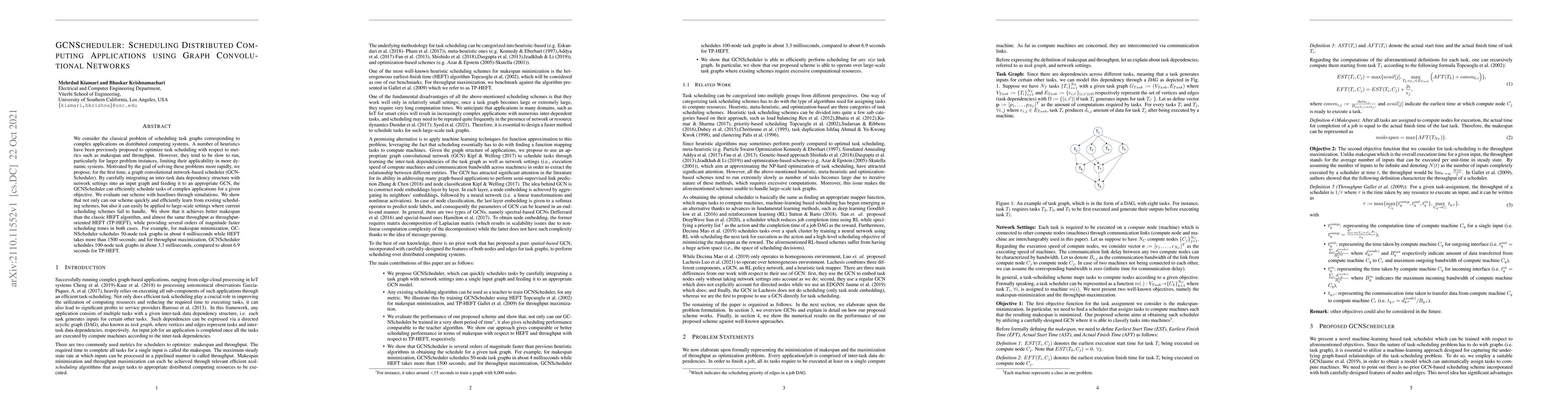 We consider the classical problem of scheduling task graphs corresponding to complex applications on distributed computing systems. A number of heuristics have been previously proposed to optimize task scheduling with respect to metrics such as makespan and throughput. However, they tend to be slow to run, particularly for larger problem instances, limiting their applicability in more dynamic systems. Motivated by the goal of solving these problems more rapidly, we propose, for the first time, a graph convolutional network-based scheduler (GCNScheduler). By carefully integrating an inter-task data dependency structure with network settings into an input graph and feeding it to an appropriate GCN, the GCNScheduler can efficiently schedule tasks of complex applications for a given objective. We evaluate our scheme with baselines through simulations. We show that not only can our scheme quickly and efficiently learn from existing scheduling schemes, but also it can easily be applied to large-scale settings where current scheduling schemes fail to handle. We show that it achieves better makespan than the classic HEFT algorithm, and almost the same throughput as throughput-oriented HEFT (TP-HEFT), while providing several orders of magnitude faster scheduling times in both cases. For example, for makespan minimization, GCNScheduler schedules 50-node task graphs in about 4 milliseconds while HEFT takes more than 1500 seconds; and for throughput maximization, GCNScheduler schedules 100-node task graphs in about 3.3 milliseconds, compared to about 6.9 seconds for TP-HEFT.