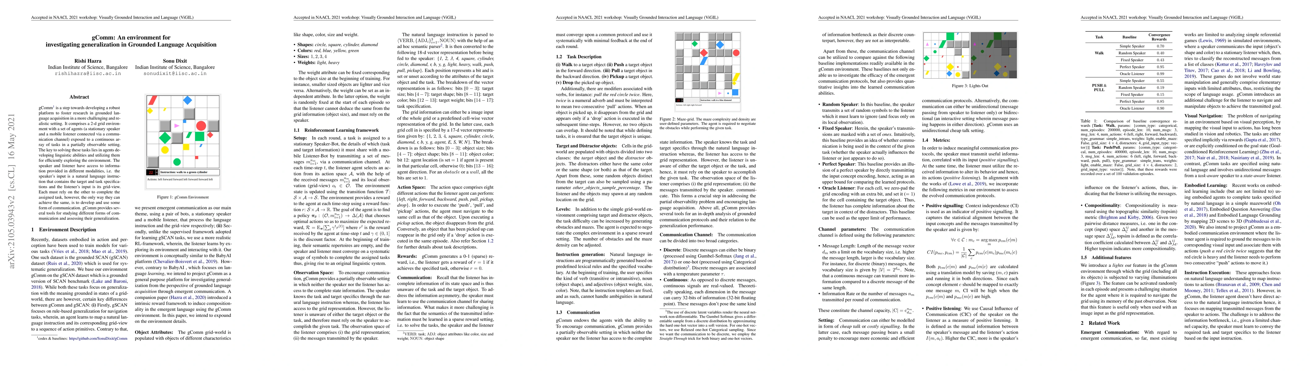 gComm is a simulated 2D environment for studying grounded language acquisition, where a stationary speaker gives natural language instructions and a mobile listener uses a grid-view to complete tasks. It enables researchers to investigate various communication forms and their generalization abilities.