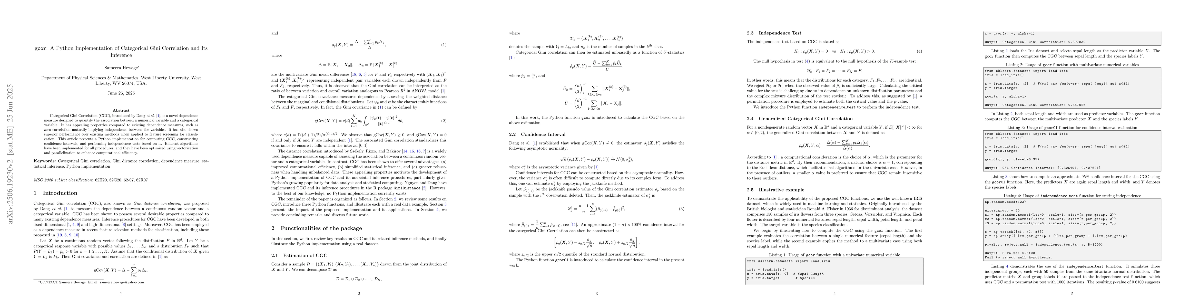 Categorical Gini Correlation (CGC), introduced by Dang et al. (2020), is a novel dependence measure designed to quantify the association between a numerical variable and a categorical variable. It has appealing properties compared to existing dependence measures, such as zero correlation mutually implying independence between the variables. It has also shown superior performance over existing methods when applied to feature screening for classification. This article presents a Python implementation for computing CGC, constructing confidence intervals, and performing independence tests based on it. Efficient algorithms have been implemented for all procedures, and they have been optimized using vectorization and parallelization to enhance computational efficiency.