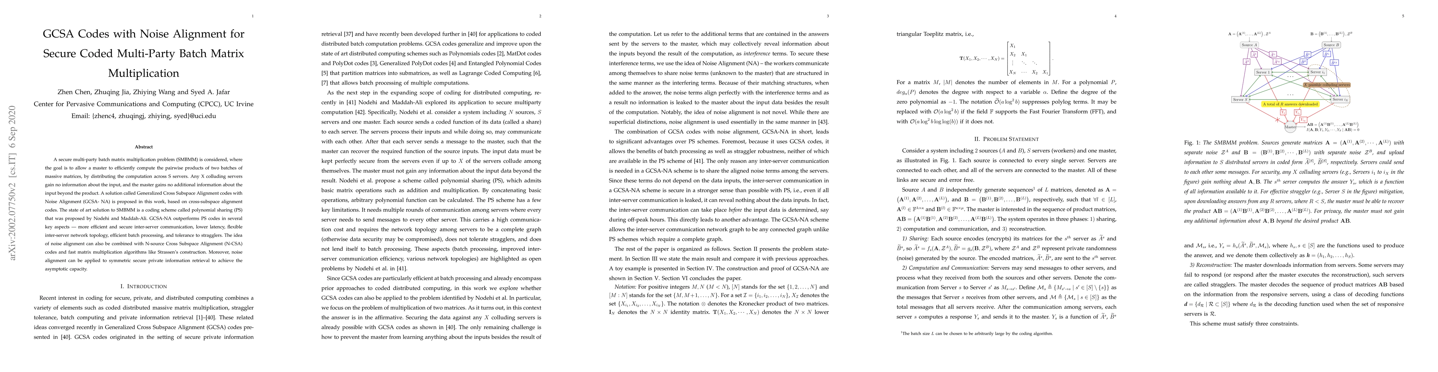 This paper proposes GCSA-NA codes for secure multi-party batch matrix multiplication, outperforming existing polynomial sharing schemes in efficiency, security, latency, and flexibility. The method leverages noise alignment to enhance inter-server communication and batch processing.