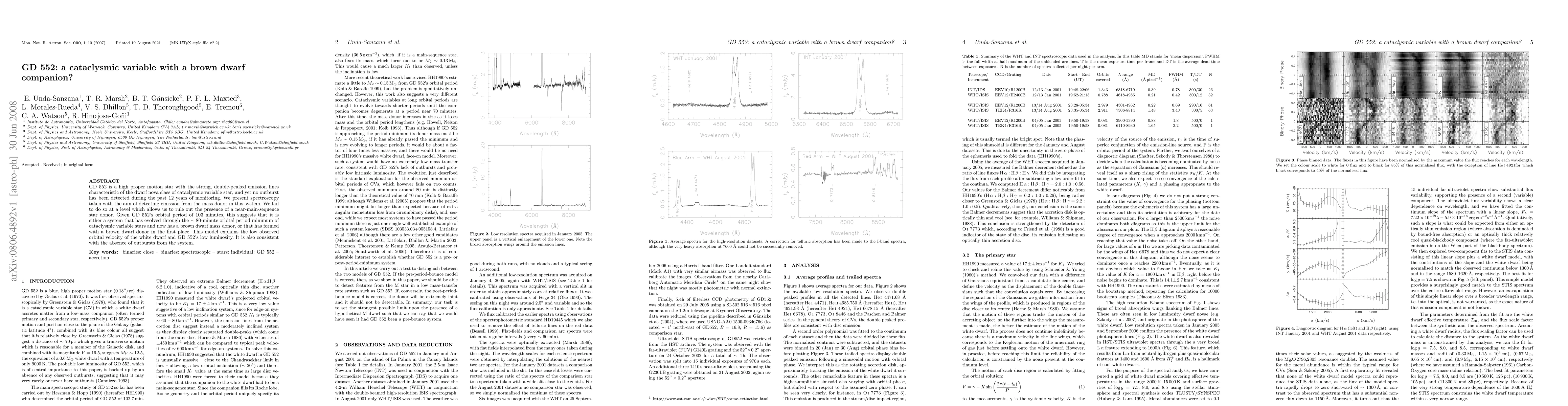 GD 552 is a dwarf nova-type cataclysmic variable with a potential brown dwarf mass donor, as no outbursts have been detected in 12 years, and spectroscopic evidence does not rule out a near-main-sequence star donor. This suggests the system may have a brown dwarf donor, explaining its low luminosity and orbital period.