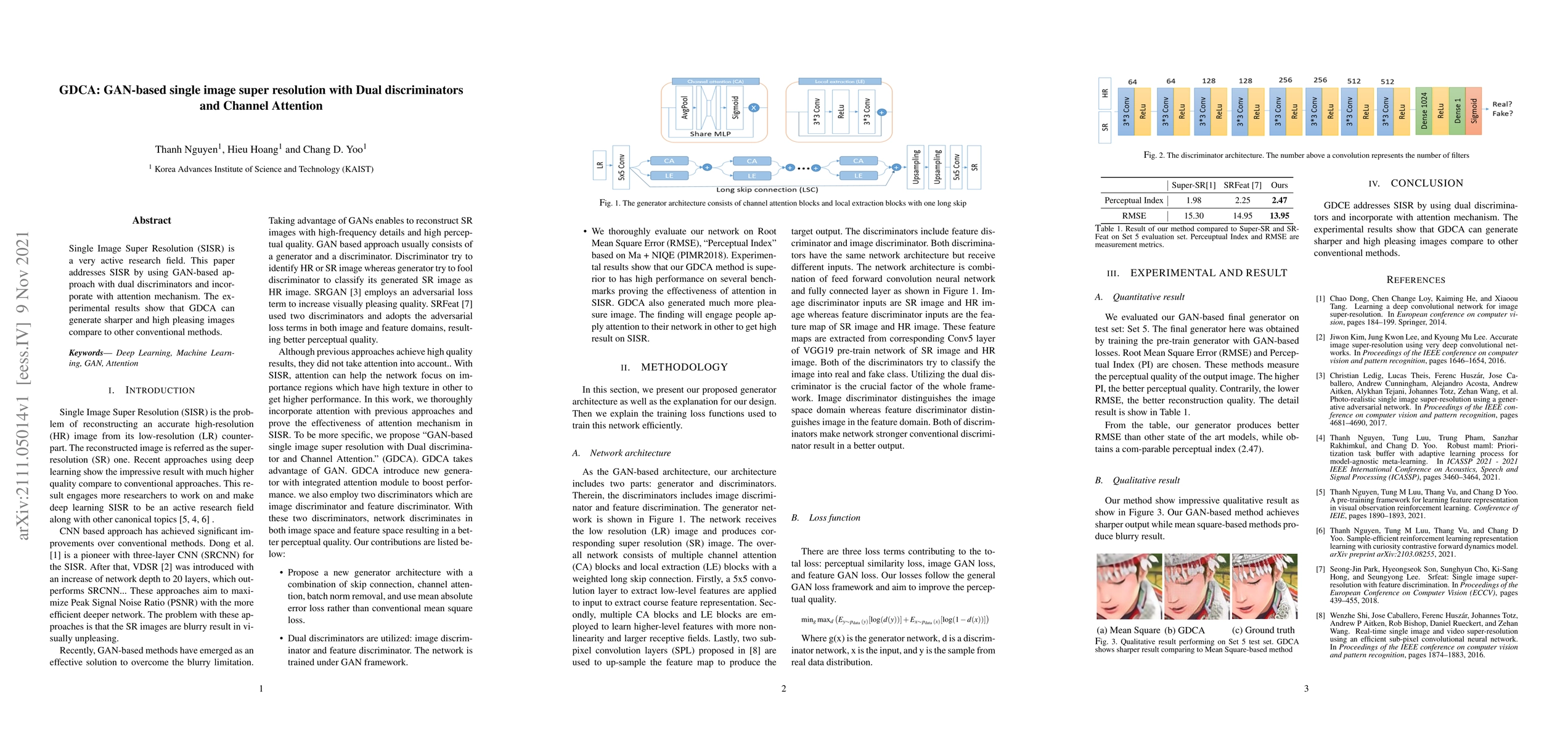 Summary: This paper proposes GDCA, a GAN-based method for Single Image Super-Resolution using dual discriminators and a Channel Attention mechanism, which generates sharper and more pleasing images compared to conventional techniques.
