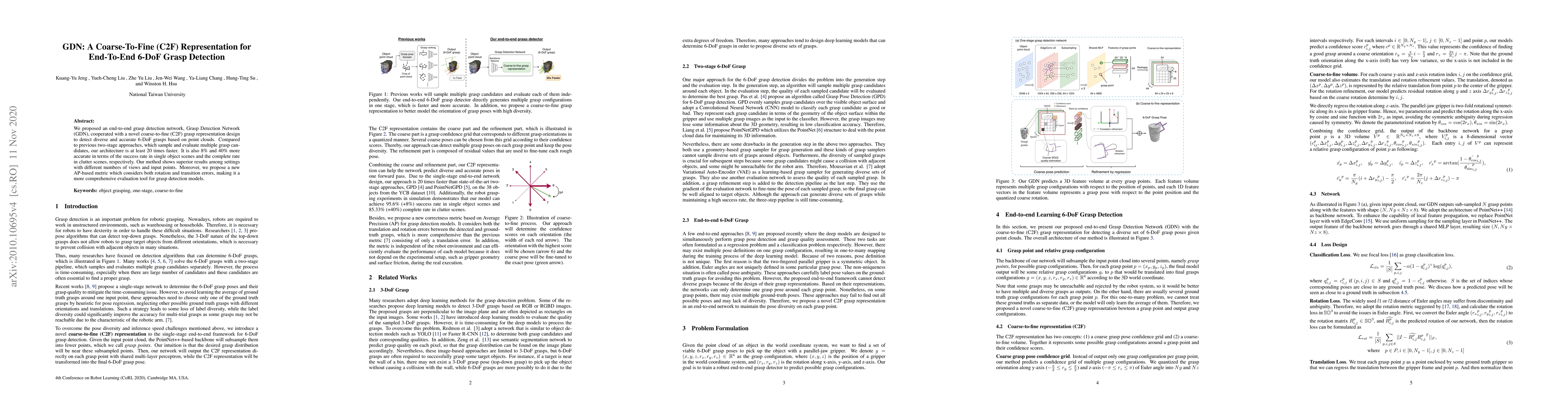 The Grasp Detection Network (GDN) employs a novel coarse-to-fine representation to achieve end-to-end 6-DoF grasp detection from point clouds, significantly outperforming previous two-stage methods in speed and accuracy, especially in cluttered environments.