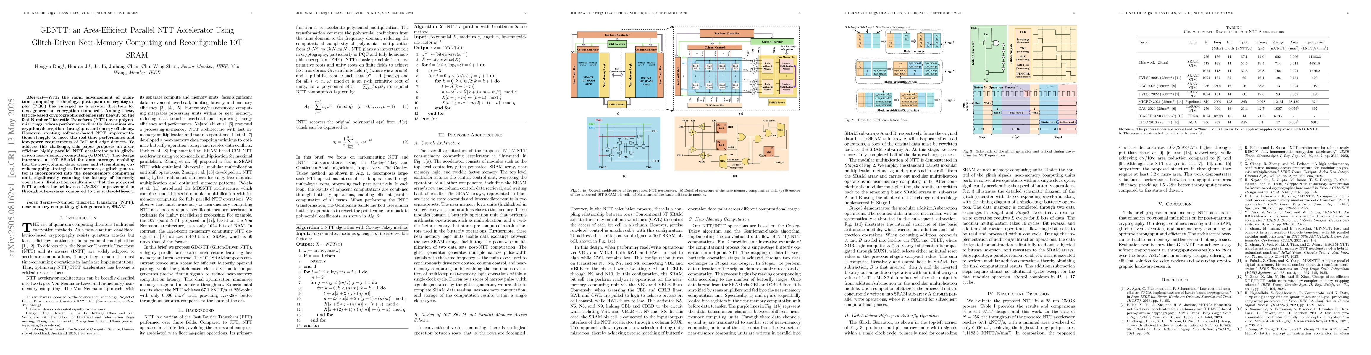 The main technical contribution is the design of GDNTT, an area-efficient parallel NTT accelerator using glitch-driven near-memory computing and reconfigurable 10T SRAM.