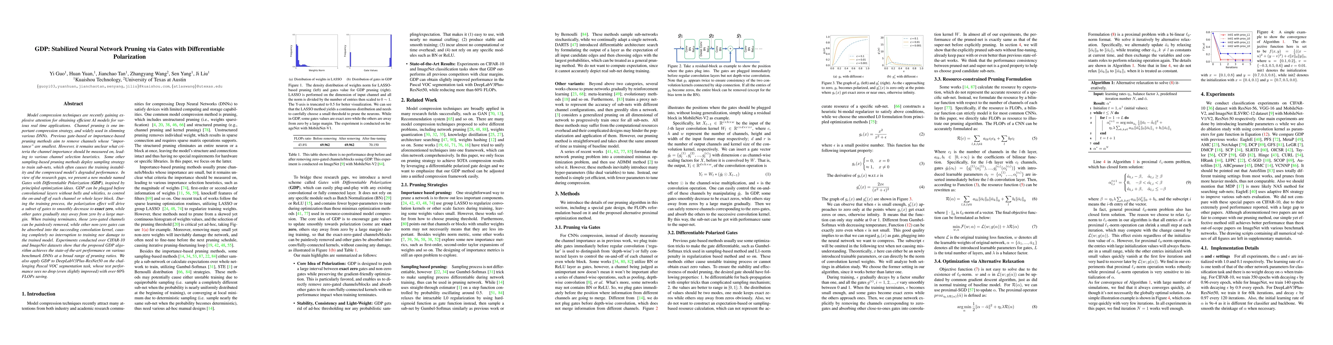 A new pruning method called Gates with Differentiable Polarization (GDP) achieves state-of-the-art performance on various deep neural networks by smoothly reducing channel importance during training.