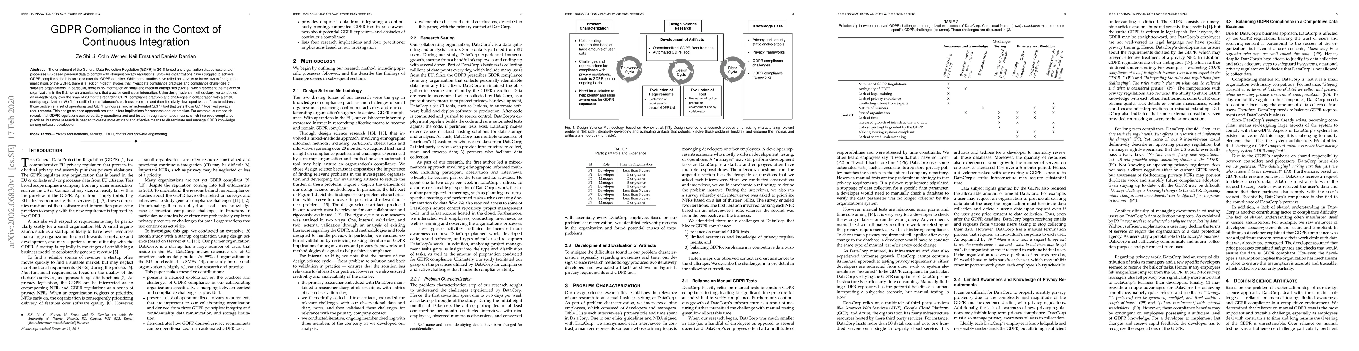 The enactment of the General Data Protection Regulation (GDPR) in 2018 forced any organization that collects and/or processes EU-based personal data to comply with stringent privacy regulations. Software organizations have struggled to achieve GDPR compliance both before and after the GDPR deadline. While some studies have relied on surveys or interviews to find general implications of the GDPR, there is a lack of in-depth studies that investigate compliance practices and compliance challenges of software organizations. In particular, there is no information on small and medium enterprises (SMEs), which represent the majority of organizations in the EU, nor on organizations that practice continuous integration. Using design science methodology, we conducted an in-depth study over the span of 20 months regarding GDPR compliance practices and challenges in collaboration with a small, startup organization. We first identified our collaborator's business problems and then iteratively developed two artifacts to address those problems: a set of operationalized GDPR principles, and an automated GDPR tool that tests those GDPR-derived privacy requirements. This design science approach resulted in four implications for research and for practice. For example, our research reveals that GDPR regulations can be partially operationalized and tested through automated means, which improves compliance practices, but more research is needed to create more efficient and effective means to disseminate and manage GDPR knowledge among software developers.