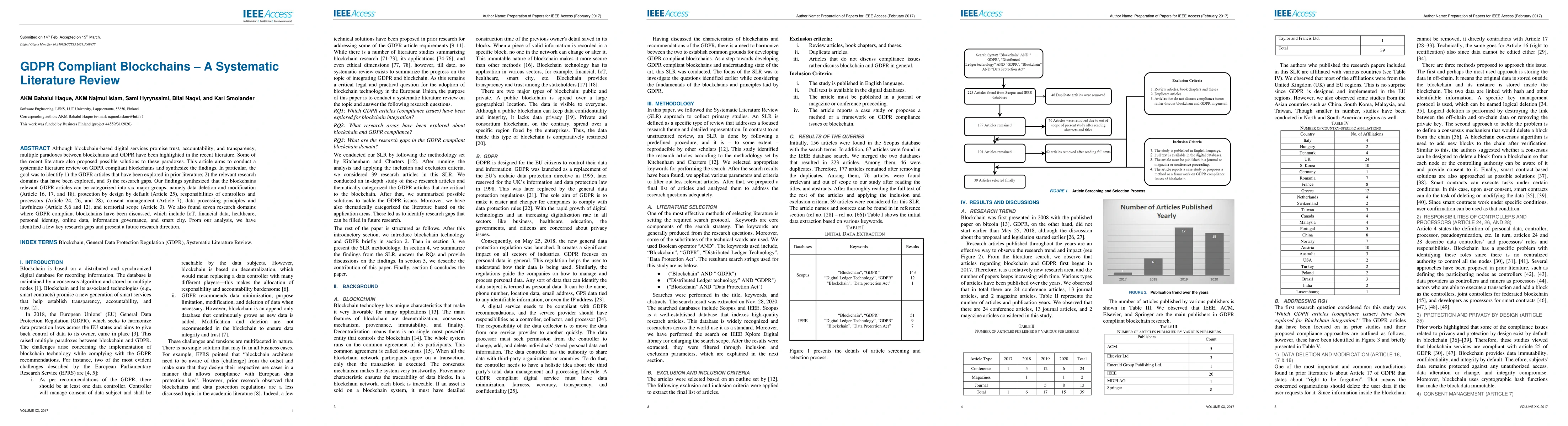 This paper systematically reviews literature on GDPR compliant blockchains, identifying six major GDPR articles and seven research domains where compliance has been explored. Key research gaps are highlighted, suggesting future directions for research.