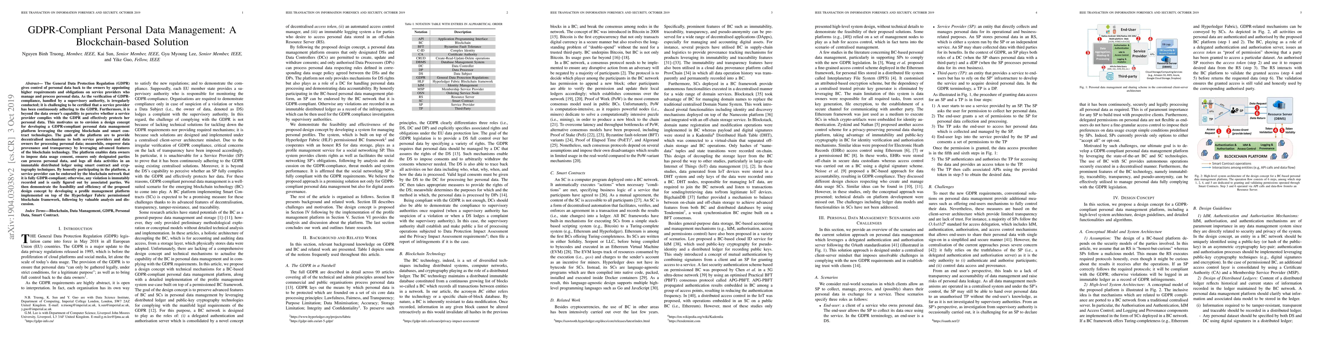 This paper proposes a GDPR-compliant personal data management platform utilizing blockchain and smart contracts to enhance data transparency and compliance verification. The platform aims to empower data owners and service providers, ensuring data usage consent, designated data processing, and immutable logging of data activities.