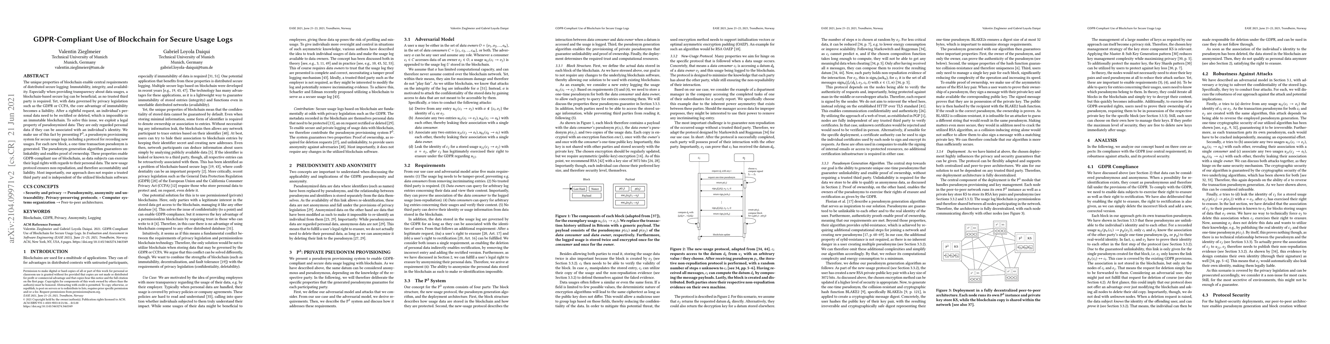 This paper proposes P3, a pseudonym provisioning system for blockchain-based secure usage logs, ensuring GDPR compliance by generating one-time transaction pseudonyms for each new block, thus enabling data subjects to exercise their rights without requiring a trusted third party. The system maintains immutability, integrity, and availability while allowing for data rectification and deletion as required by privacy legislation.