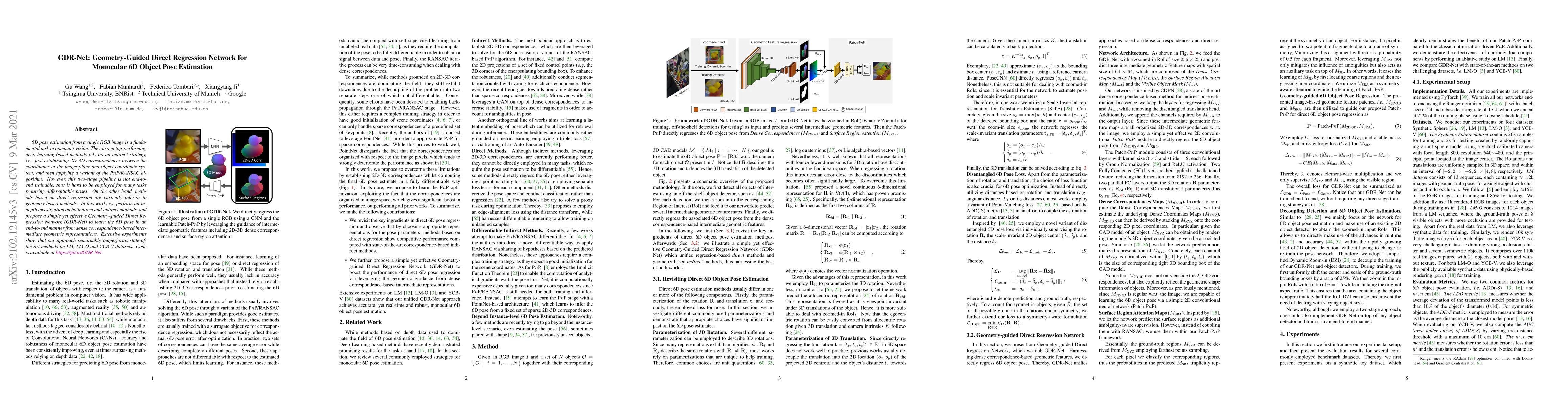 The paper proposes a Geometry-Guided Direct Regression Network (GDR-Net) for end-to-end 6D object pose estimation from monocular images, outperforming existing methods by leveraging dense correspondence-based geometric representations. The approach achieves superior results on multiple datasets, addressing the limitations of indirect two-stage methods.