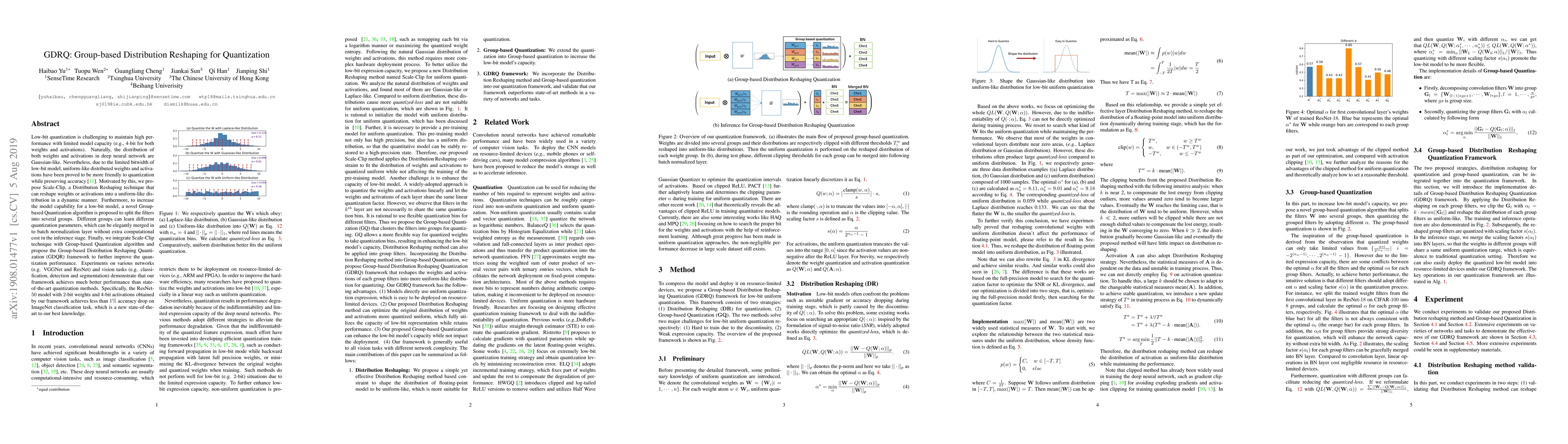 Low-bit quantization is challenging to maintain high performance with limited model capacity (e.g., 4-bit for both weights and activations). Naturally, the distribution of both weights and activations in deep neural network are Gaussian-like. Nevertheless, due to the limited bitwidth of low-bit model, uniform-like distributed weights and activations have been proved to be more friendly to quantization while preserving accuracy~\cite{Han2015Learning}. Motivated by this, we propose Scale-Clip, a Distribution Reshaping technique that can reshape weights or activations into a uniform-like distribution in a dynamic manner. Furthermore, to increase the model capability for a low-bit model, a novel Group-based Quantization algorithm is proposed to split the filters into several groups. Different groups can learn different quantization parameters, which can be elegantly merged in to batch normalization layer without extra computational cost in the inference stage. Finally, we integrate Scale-Clip technique with Group-based Quantization algorithm and propose the Group-based Distribution Reshaping Quantization (GDQR) framework to further improve the quantization performance. Experiments on various networks (e.g. VGGNet and ResNet) and vision tasks (e.g. classification, detection and segmentation) demonstrate that our framework achieves good performance.