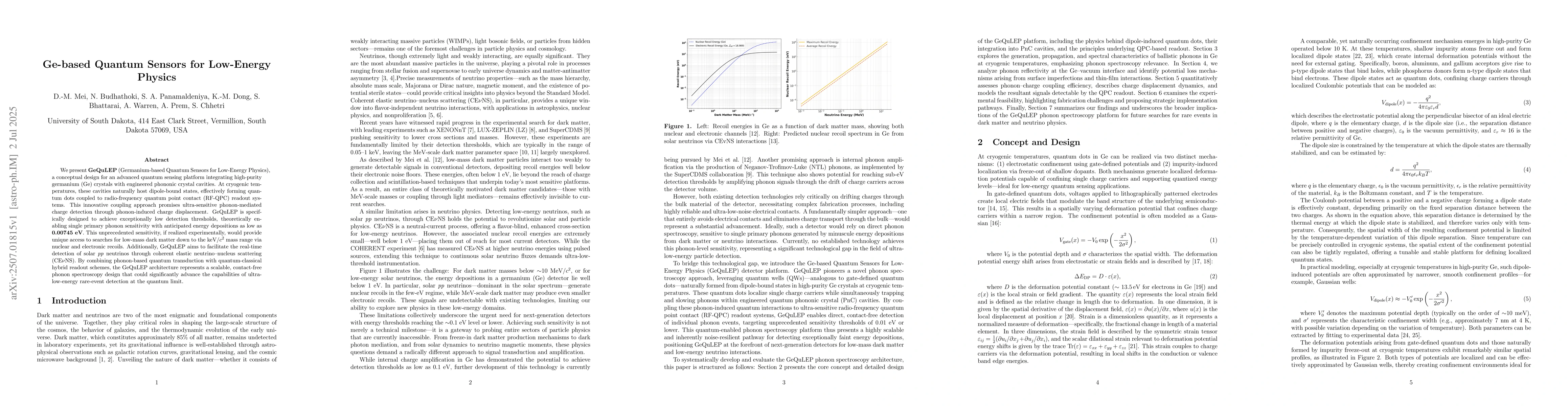 We present \textbf{GeQuLEP} (Germanium-based Quantum Sensors for Low-Energy Physics), a conceptual design for an advanced quantum sensing platform integrating high-purity germanium (Ge) crystals with engineered phononic crystal cavities. At cryogenic temperatures, these cavities naturally host dipole-bound states, effectively forming quantum dots coupled to radio-frequency quantum point contact (RF-QPC) readout systems. This innovative coupling approach promises ultra-sensitive phonon-mediated charge detection through phonon-induced charge displacement. GeQuLEP is specifically designed to achieve exceptionally low detection thresholds, theoretically enabling single primary phonon sensitivity with anticipated energy depositions as low as \textbf{0.00745~eV}. This unprecedented sensitivity, if realized experimentally, would provide unique access to searches for low-mass dark matter down to the keV/$c^2$ mass range via nuclear and electronic recoils. Additionally, GeQuLEP aims to facilitate the real-time detection of solar \textit{pp} neutrinos through coherent elastic neutrino--nucleus scattering (CE$\nu$NS). By combining phonon-based quantum transduction with quantum-classical hybrid readout schemes, the GeQuLEP architecture represents a scalable, contact-free phonon spectroscopy design that could significantly advance the capabilities of ultra-low-energy rare-event detection at the quantum limit.