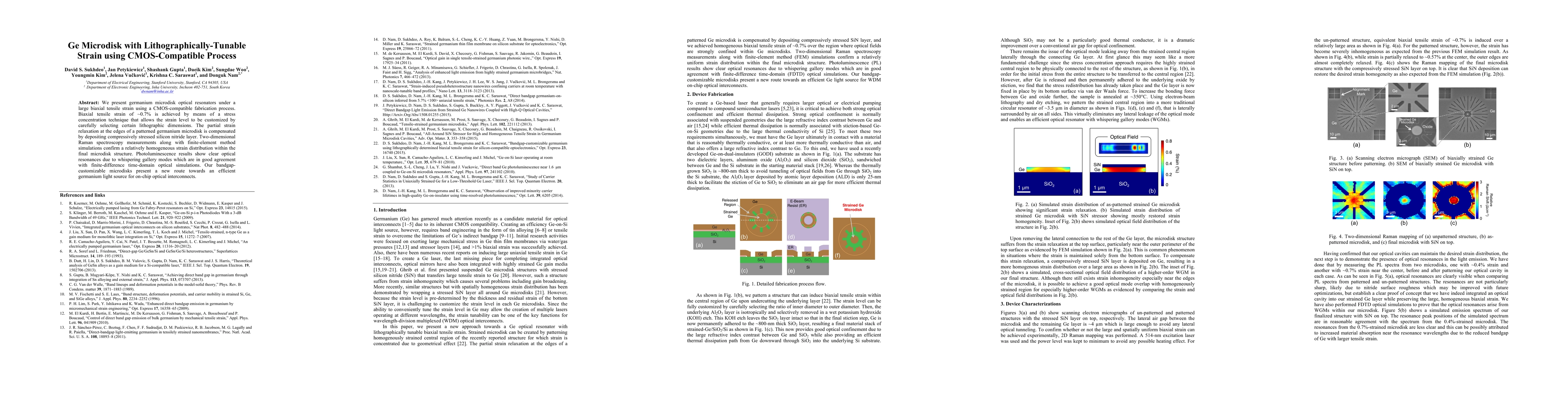 This paper introduces germanium microdisk optical resonators with tunable biaxial tensile strain via a CMOS-compatible process, achieving ~0.7% strain through lithographic customization and compensating strain relaxation with a silicon nitride layer. The study confirms homogeneous strain distribution and demonstrates optical resonances suitable for on-chip optical interconnects.