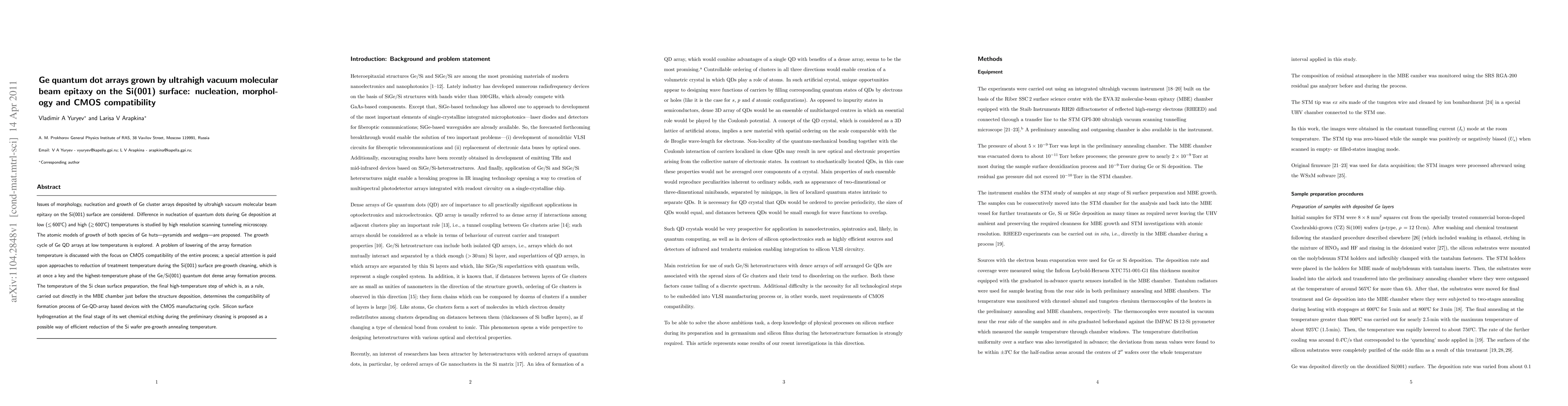 This study investigates the nucleation, morphology, and CMOS compatibility of Ge quantum dot arrays grown via ultrahigh vacuum molecular beam epitaxy on Si(001) surfaces. It proposes atomic models for Ge quantum dot growth at different temperatures and discusses strategies to lower formation temperatures, emphasizing silicon surface hydrogenation to reduce pre-growth cleaning temperatures and ensure CMOS compatibility.