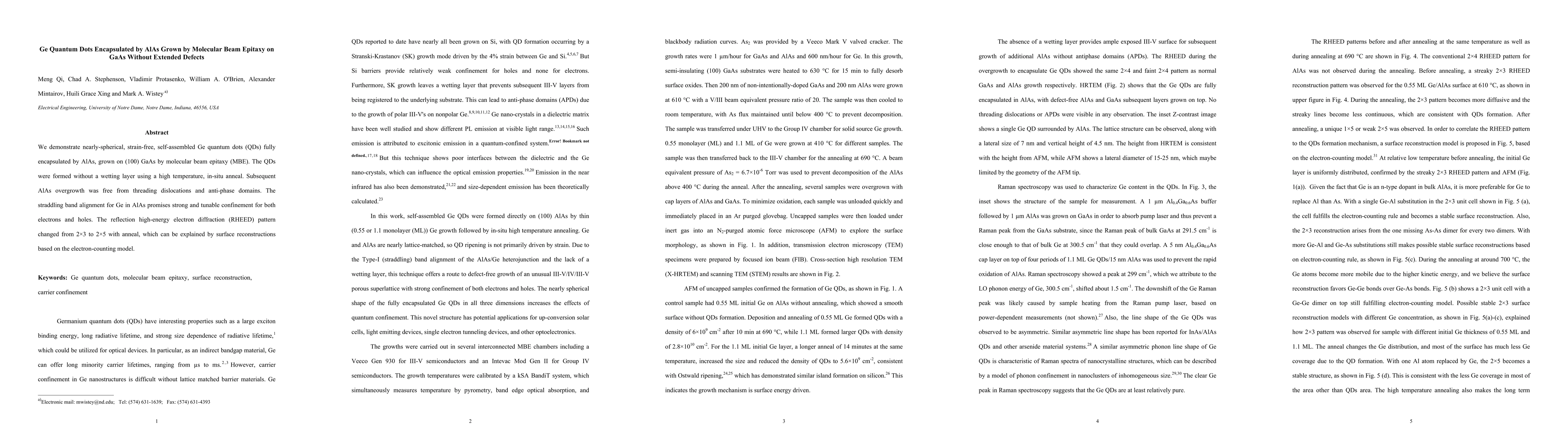 This paper reports the successful growth of nearly-spherical, strain-free Ge quantum dots encapsulated by AlAs on GaAs via molecular beam epitaxy, without extended defects. The self-assembly process and high-temperature anneal ensure strong and tunable confinement for both electrons and holes.