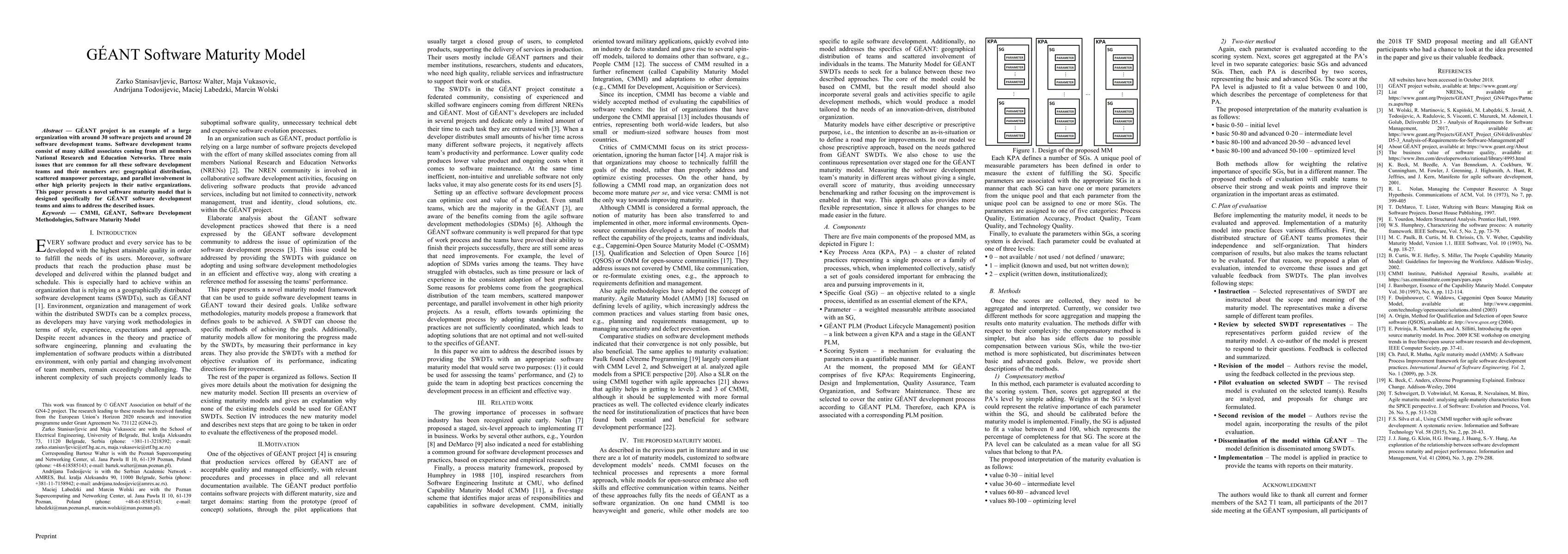 The G\'EANT project, comprising 30 software projects and 20 development teams, faces challenges like geographical distribution and parallel project involvement. This paper introduces a tailored software maturity model to address these specific issues for G\'EANT's diverse teams.