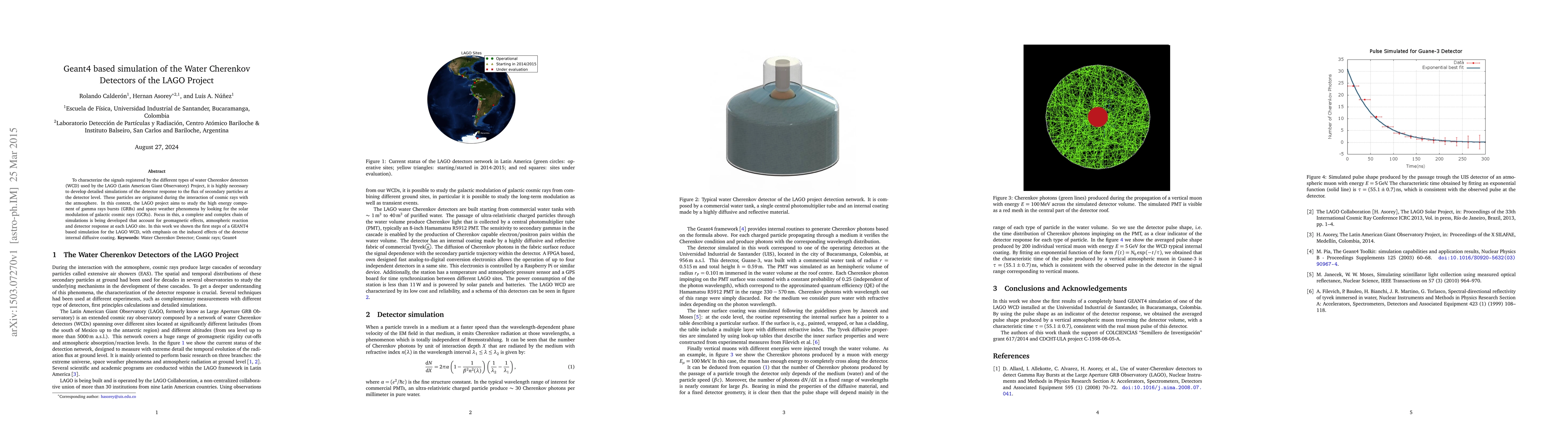 This work is novel in its use of a GEANT4 based simulation framework to study the response of water Cherenkov detectors to secondary particles, and its application to the LAGO project.