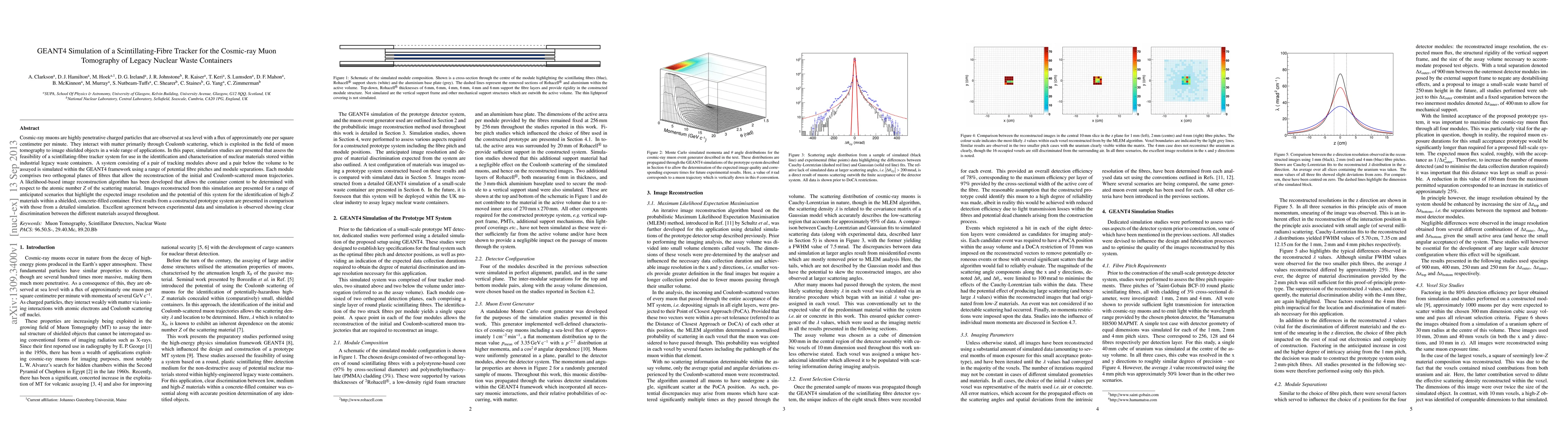 This paper presents GEANT4 simulations of a scintillating-fibre tracker for muon tomography to identify and characterize nuclear materials in legacy waste containers. The simulation assesses the feasibility of the system and demonstrates its potential for high-Z material discrimination, with excellent agreement between experimental and simulated results.