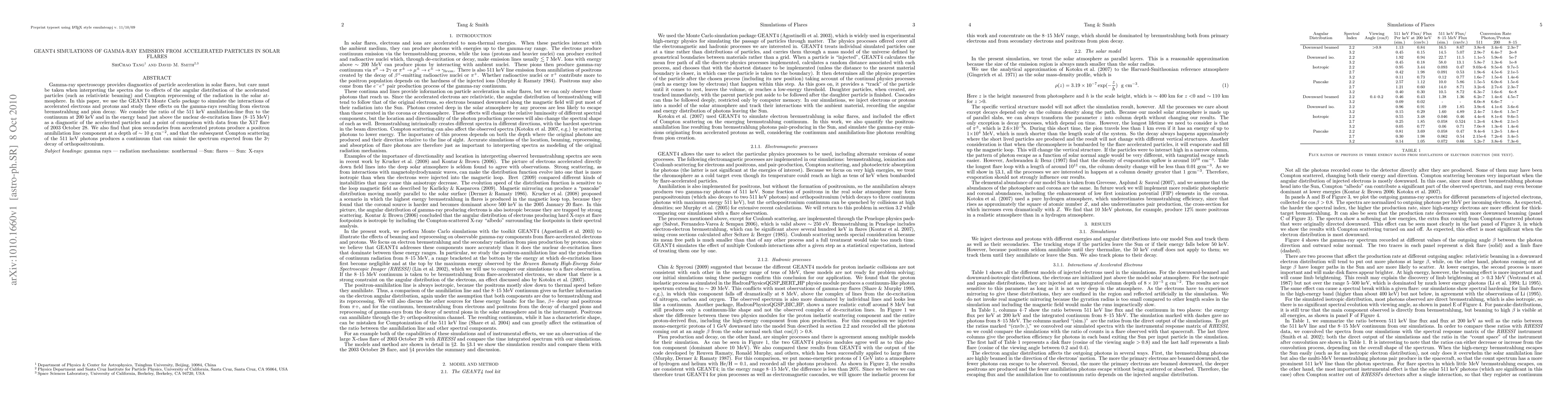 Gamma-ray spectroscopy provides diagnostics of particle acceleration in solar flares, but care must be taken when interpreting the spectra due to effects of the angular distribution of the accelerated particles (such as relativistic beaming) and Compton reprocessing of the radiation in the solar atmosphere. In this paper, we use the GEANT4 Monte Carlo package to simulate the interactions of accelerated electrons and protons and study these effects on the gamma-rays resulting from electron bremsstrahlung and pion decay. We consider the ratio of the 511~keV annihilation-line flux to the continuum at 200~keV and in the energy band just above the nuclear de-excitation lines (8--15~MeV) as a diagnostic of the accelerated particles and a point of comparison with data from the X17 flare of 2003 October 28. We also find that pion secondaries from accelerated protons produce a positron annihilation line component at a depth of $\sim$ 10 g cm$^{-2}$, and that the subsequent Compton scattering of the 511~keV photons produces a continuum that can mimic the spectrum expected from the 3$\gamma$ decay of orthopositronium.