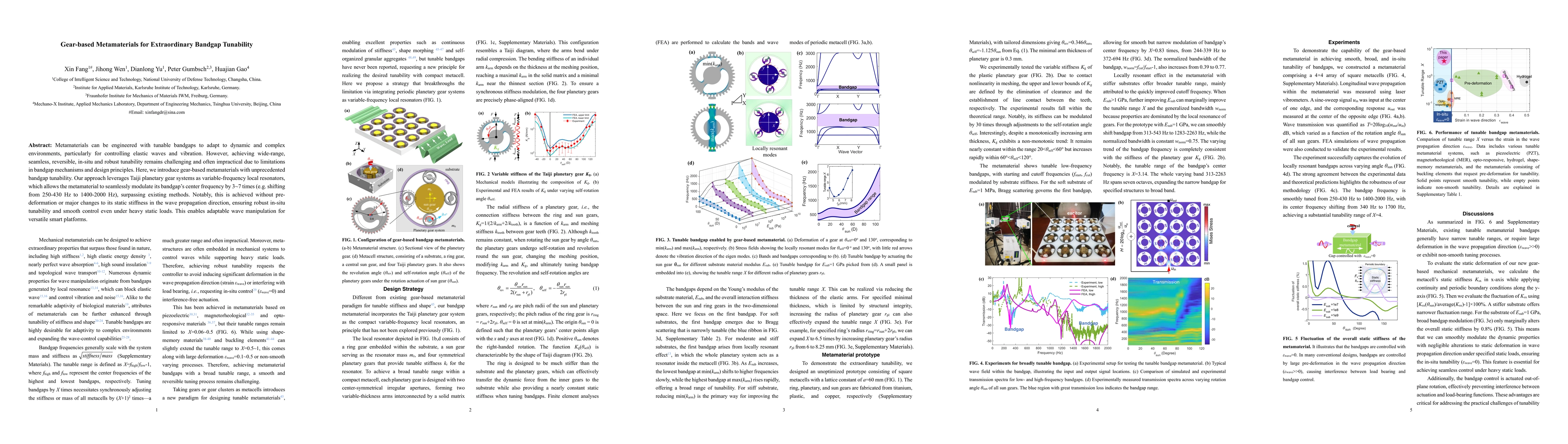 Metamaterials can be engineered with tunable bandgaps to adapt to dynamic and complex environments, particularly for controlling elastic waves and vibration. However, achieving wide-range, seamless, reversible, in-situ and robust tunability remains challenging and often impractical due to limitations in bandgap mechanisms and design principles. Here, we introduce gear-based metamaterials with unprecedented bandgap tunability. Our approach leverages Taiji planetary gear systems as variable-frequency local resonators, which allows the metamaterial to seamlessly modulate its bandgap's center frequency by 3-7 times (e.g. shifting from 250-430 Hz to 1400-2000 Hz), surpassing existing methods. Notably, this is achieved without pre-deformation or major changes to its static stiffness in the wave propagation direction, ensuring robust in-situ tunability and smooth control even under heavy static loads. This enables adaptable wave manipulation for versatile smart platforms.
