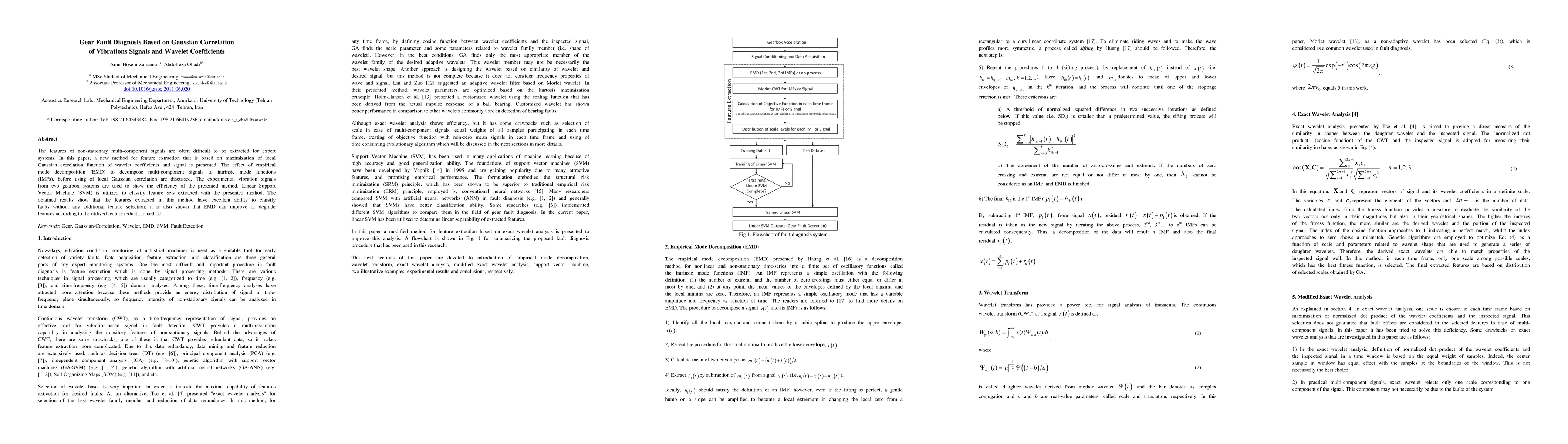 A new method for gear fault diagnosis uses Gaussian correlation of wavelet coefficients to extract features from non-stationary signals, achieving excellent classification accuracy without additional feature selection.