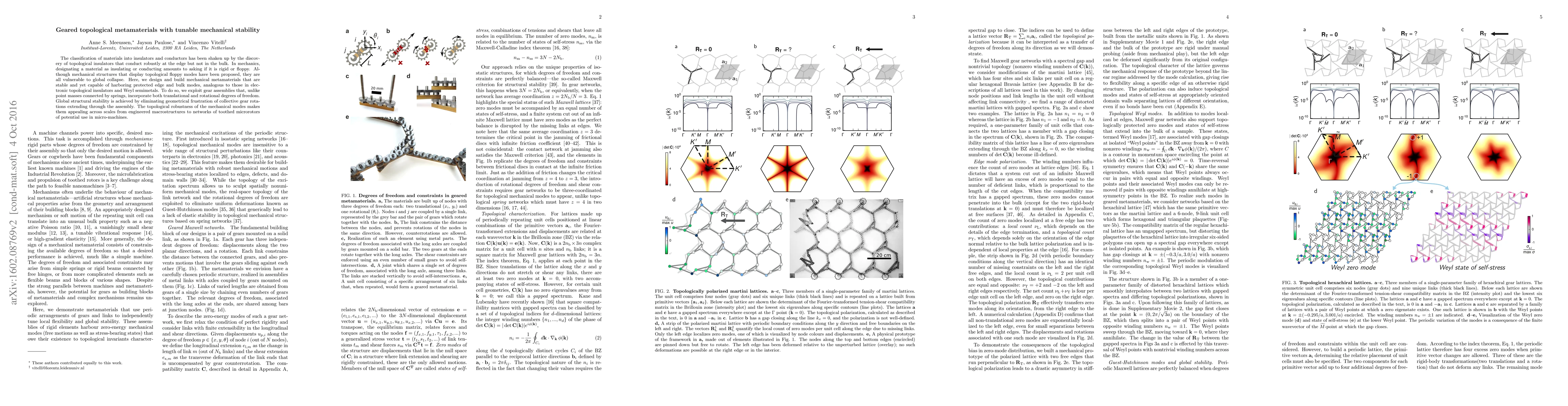 The classification of materials into insulators and conductors has been shaken up by the discovery of topological insulators that conduct robustly at the edge but not in the bulk. In mechanics, designating a material as insulating or conducting amounts to asking if it is rigid or floppy. Although mechanical structures that display topological floppy modes have been proposed, they are all vulnerable to global collapse. Here, we design and build mechanical metamaterials that are stable and yet capable of harboring protected edge and bulk modes, analogous to those in electronic topological insulators and Weyl semimetals. To do so, we exploit gear assemblies that, unlike point masses connected by springs, incorporate both translational and rotational degrees of freedom. Global structural stability is achieved by eliminating geometrical frustration of collective gear rotations extending through the assembly. The topological robustness of the mechanical modes makes them appealing across scales from engineered macrostructures to networks of toothed microrotors of potential use in micro-machines.