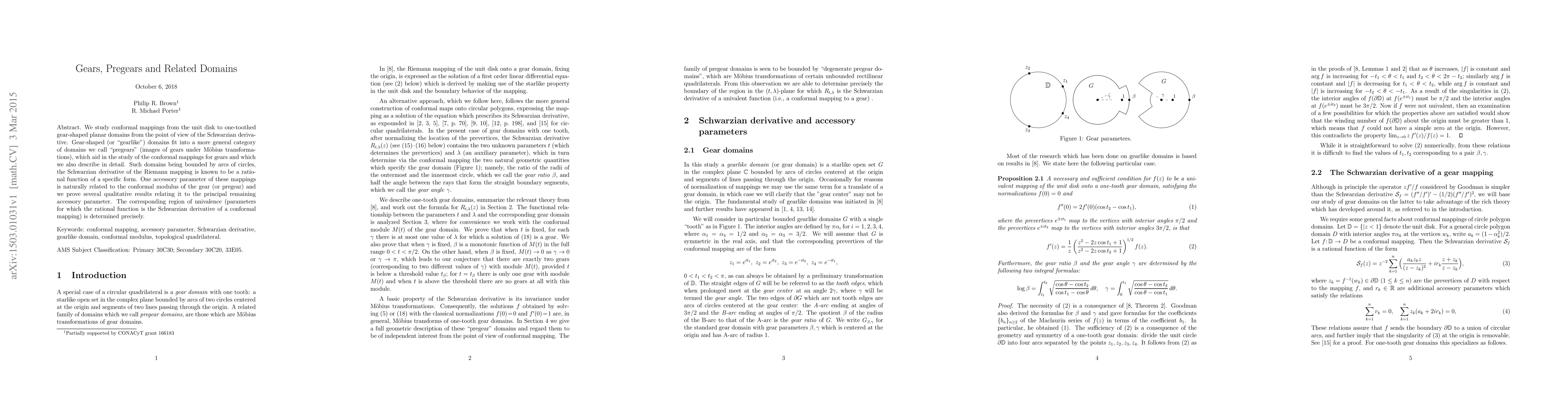We study conformal mappings from the unit disk to one-toothed gear-shaped planar domains from the point of view of the Schwarzian derivative. Gear-shaped (or "gearlike") domains fit into a more general category of domains we call "pregears" (images of gears under Mobius transformations), which aid in the study of the conformal mappings for gears and which we also describe in detail. Such domains being bounded by arcs of circles, the Schwarzian derivative of the Riemann mapping is known to be a rational function of a specific form. One accessory parameter of these mappings is naturally related to the conformal modulus of the gear (or pregear) and we prove several qualitative results relating it to the principal remaining accessory parameter. The corresponding region of univalence (parameters for which the rational function is the Schwarzian derivative of a conformal mapping) is determined precisely.