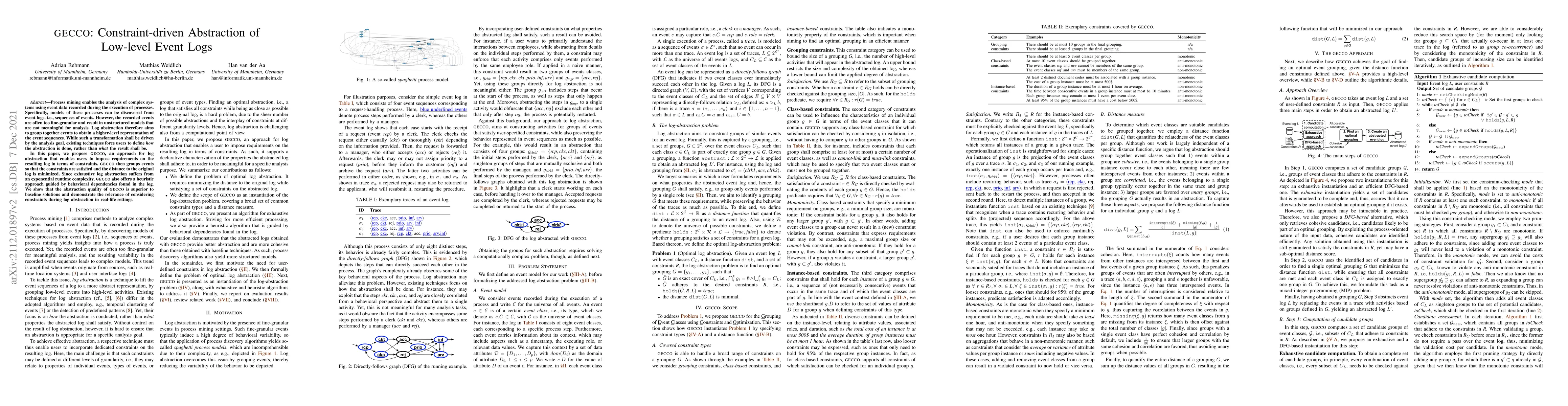 GECCO proposes a method for constraint-driven abstraction of low-level event logs, enabling users to specify desired properties of the abstracted log. This approach minimizes the distance from the original log while satisfying user-defined constraints, offering a heuristic solution to manage complexity.