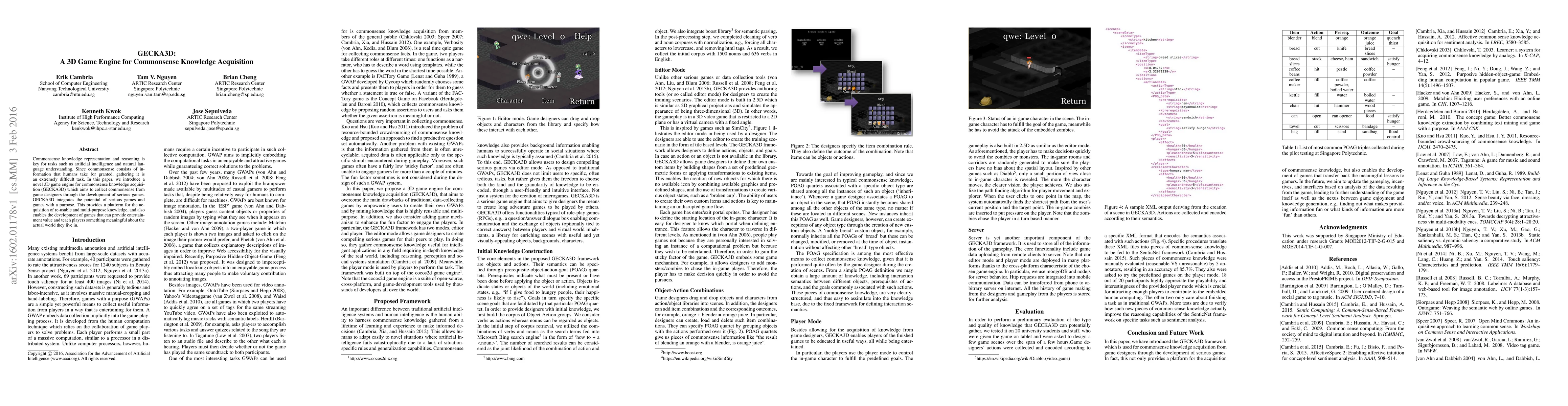 GECKA3D is a novel 3D game engine designed to gather commonsense knowledge from game designers via serious games. It aims to create a platform for acquiring reusable knowledge while developing entertaining games that educate players about real-world concepts.